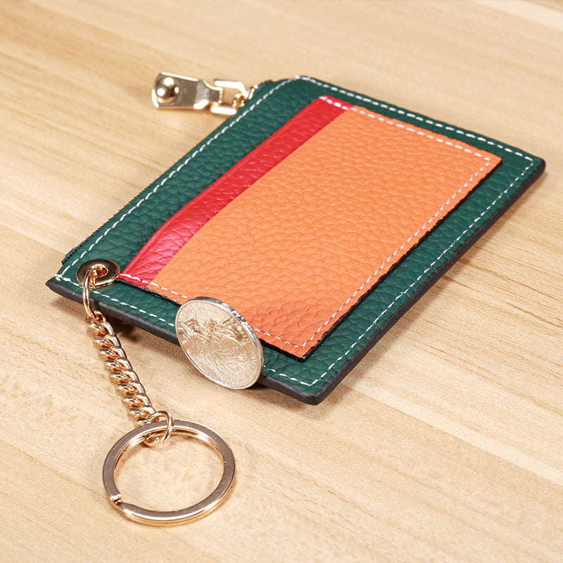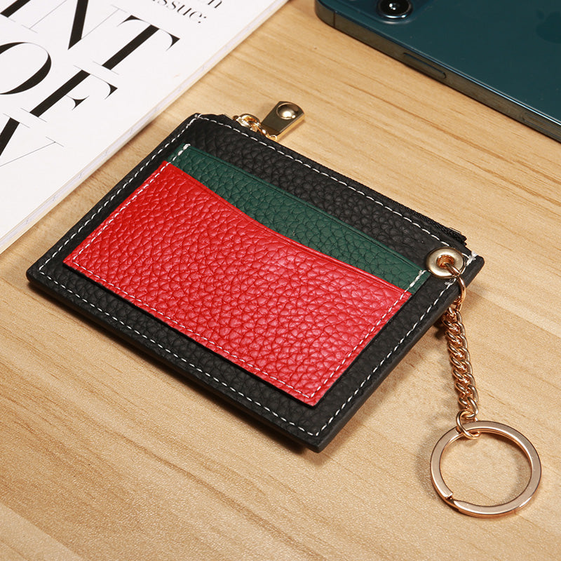 Design: Slim Womens Patchwork Red Leather Card Wallets with Keychain Cute Zip Card Holder Wallet for Women