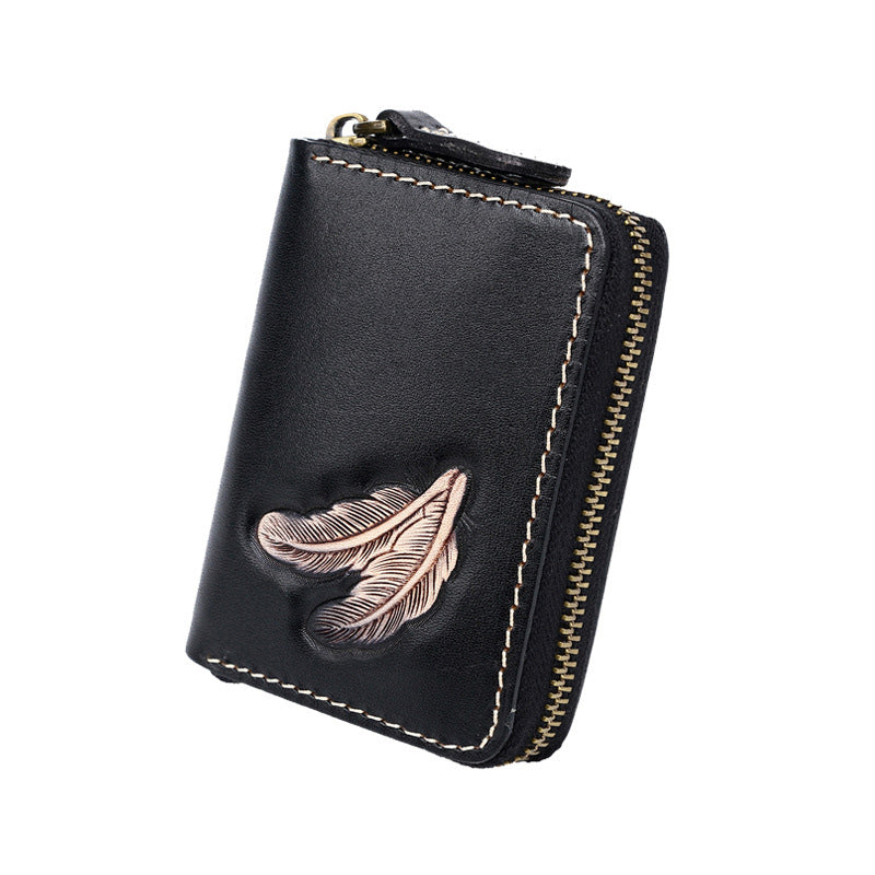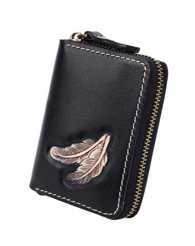 Around Zip Black Tooled Leather Card Wallet Mens Feather Zipper Card Holder for Men