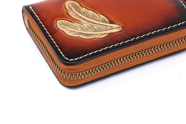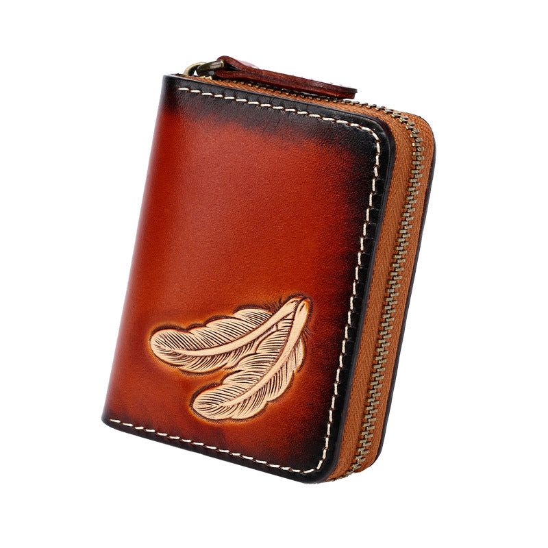 Design: Around Zip Brown Tooled Leather Card Wallet Mens Feather Zipper Card Holder for Men