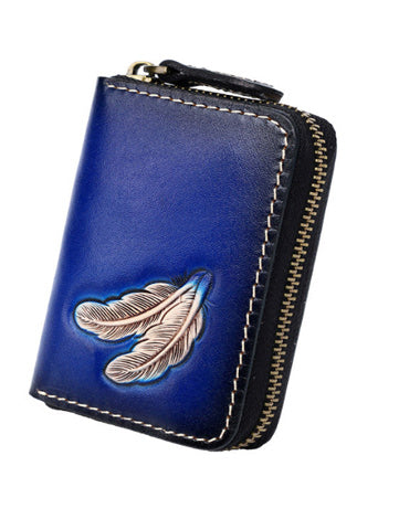 Around Zip Blue Tooled Leather Card Wallet Mens Feather Zipper Card Holder for Men