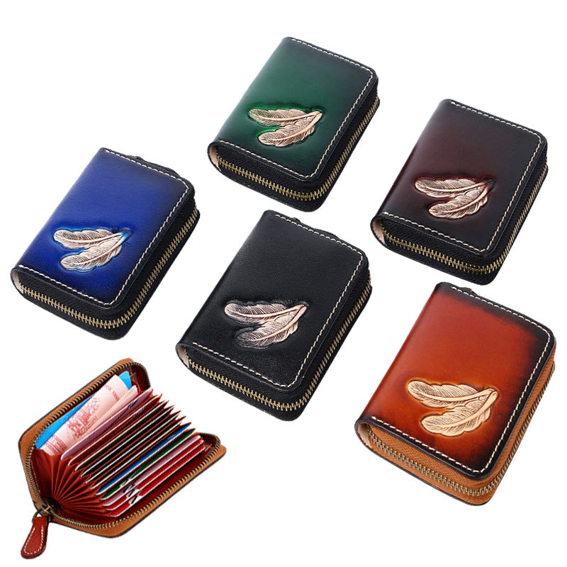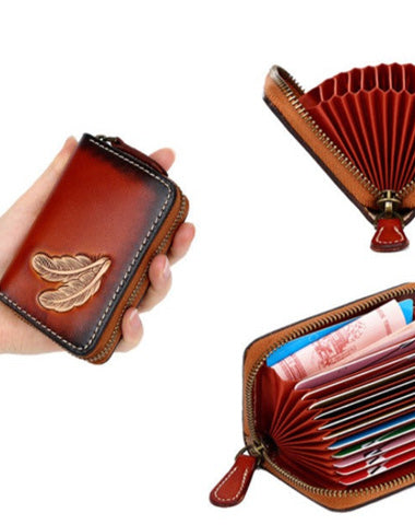 Style: Around Zip Brown Tooled Leather Card Wallet Mens Feather Zipper Card Holder for Men