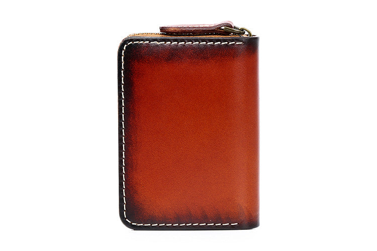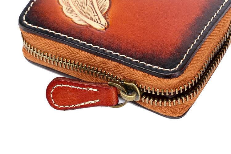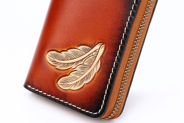 Design: Around Zip Brown Tooled Leather Card Wallet Mens Feather Zipper Card Holder for Men