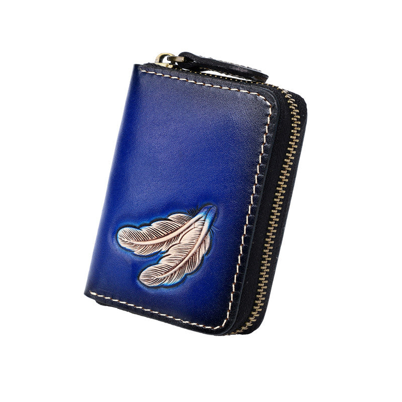 Design: Around Zip Tooled Leather Card Wallet Mens Feather Zipper Card Holder for Men