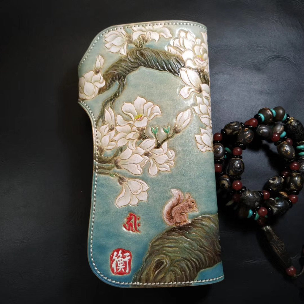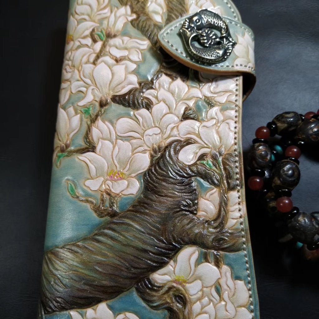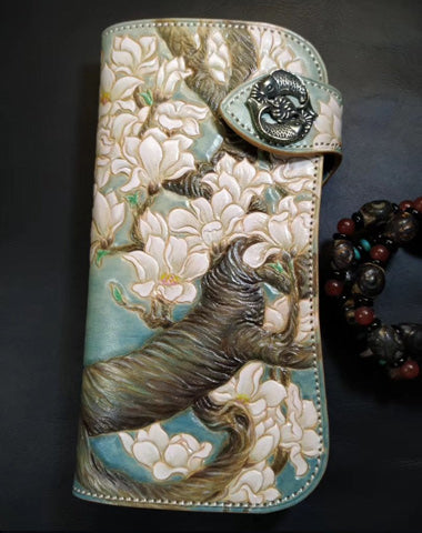 Style: Badass Sky Blue Leather Men's Cherry Blossom Tree Biker Wallet Handmade Tooled Zipper Long Wallets For Men