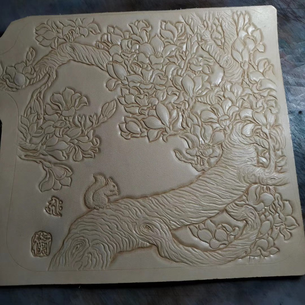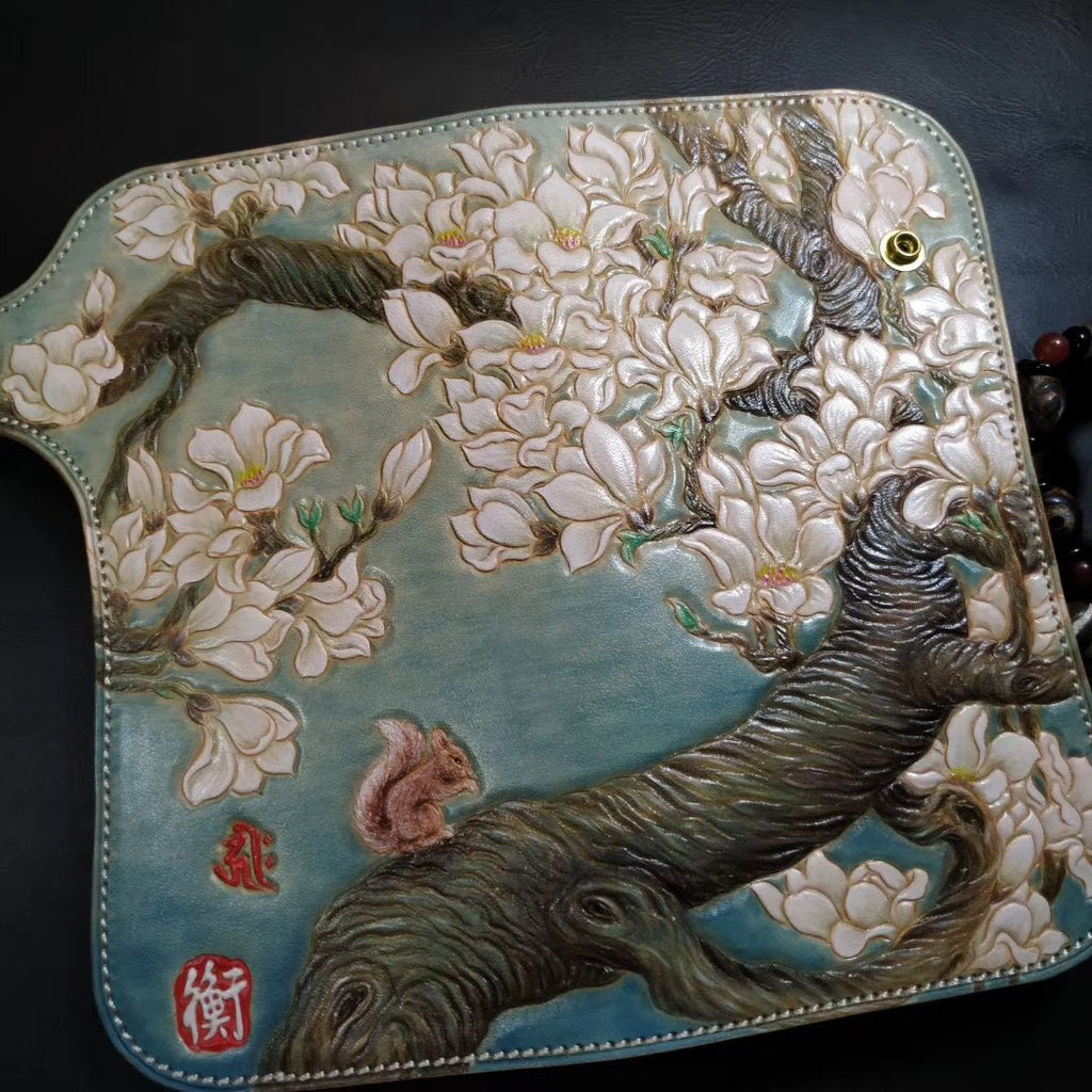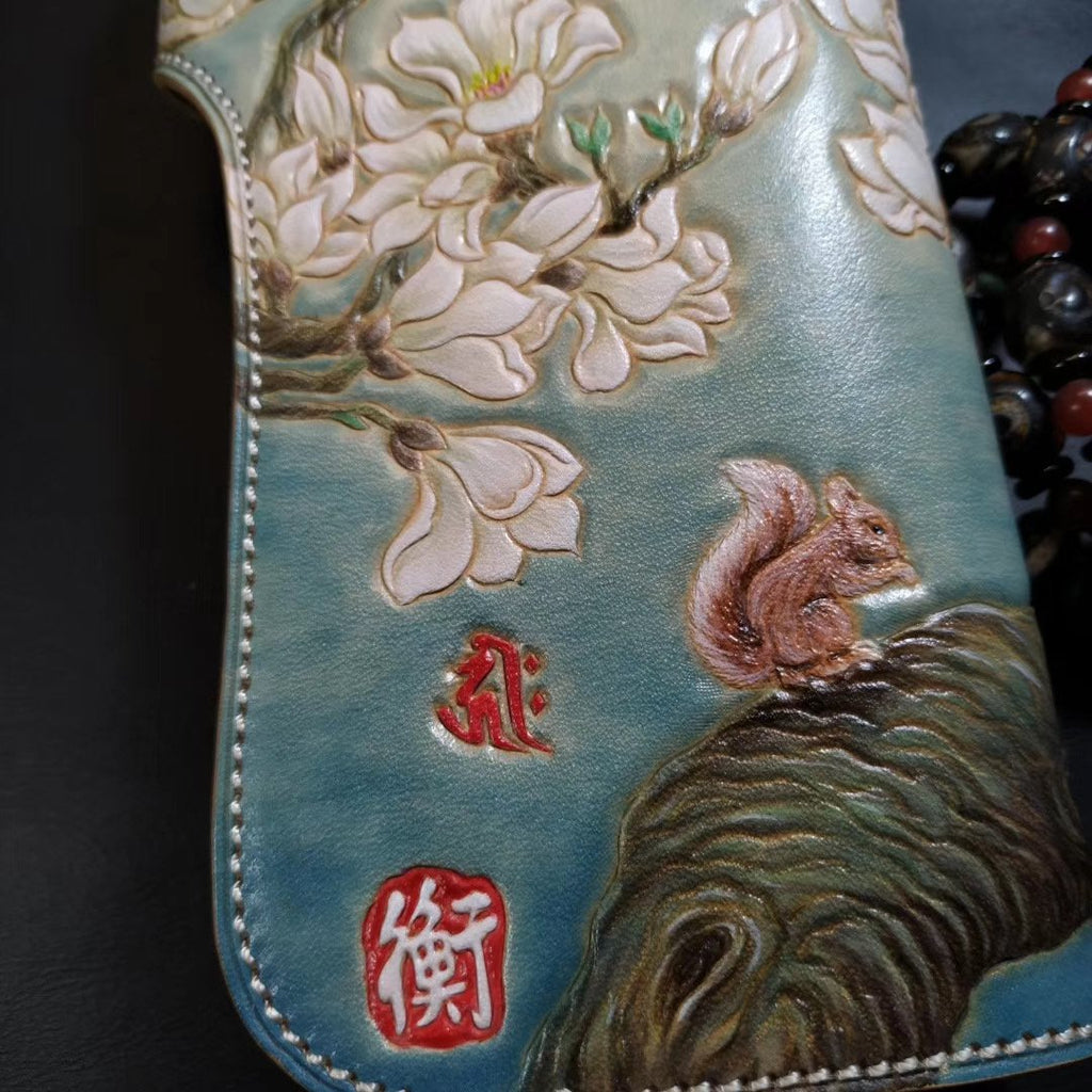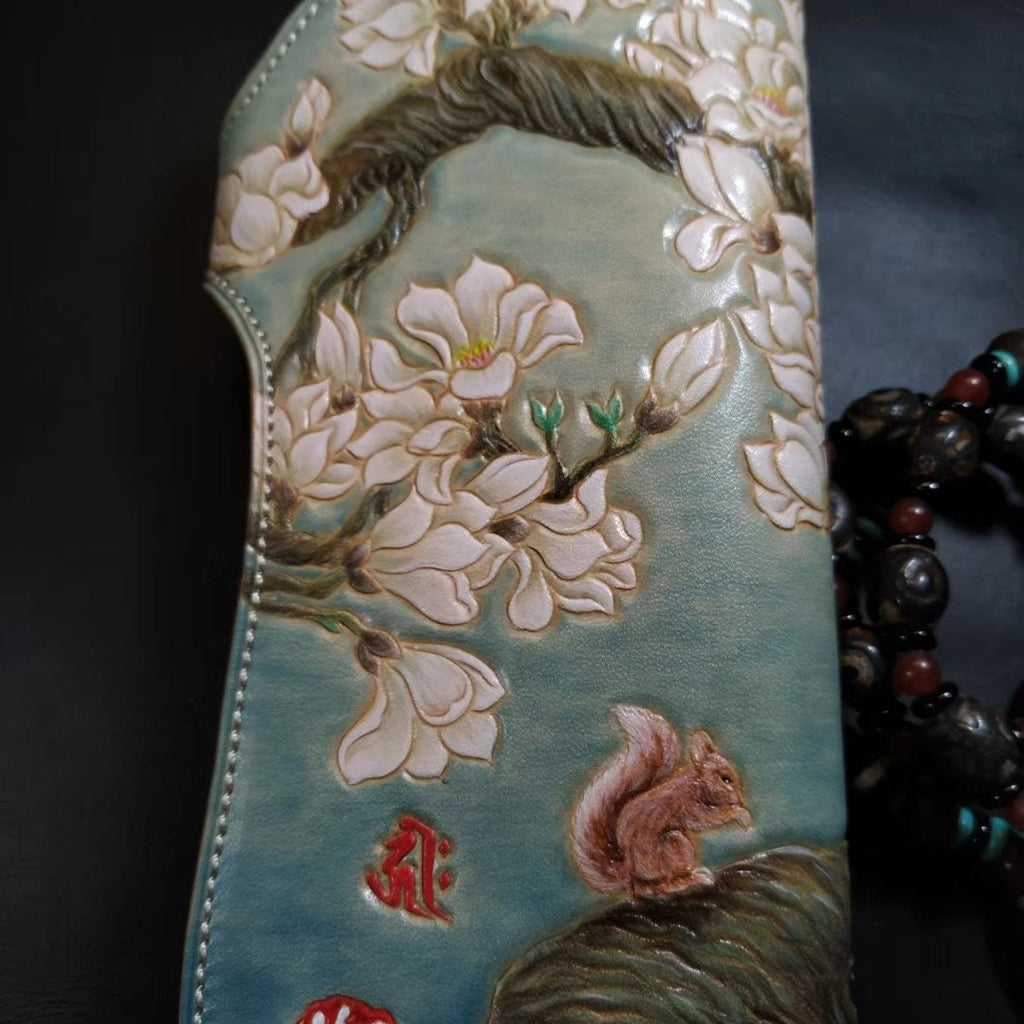 Design: Badass Sky Blue Leather Men's Cherry Blossom Tree Biker Wallet Handmade Tooled Zipper Long Wallets For Men
