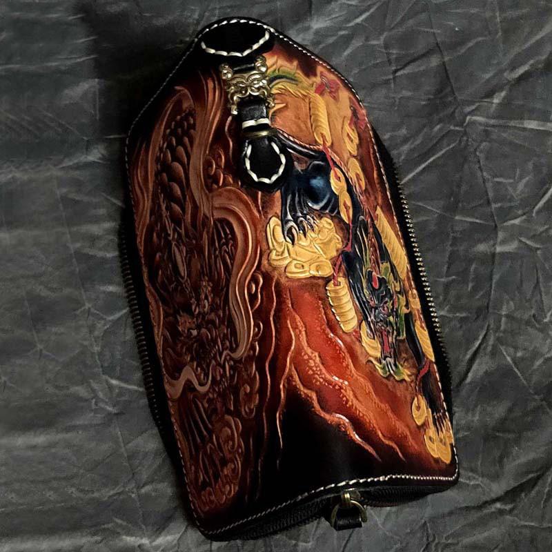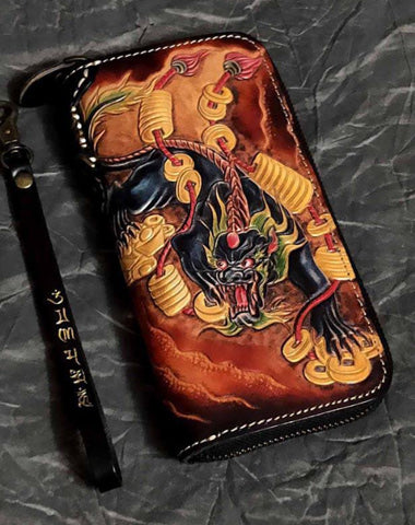 Design: Badass Black Leather Men's Long Biker Handmade Wallet Beast Tooled Zipper Long Chain Wallets For Men