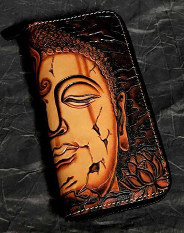 Design: Badass Black Leather Men's Long Biker Handmade Wallet Black Buddha Tooled Zipper Long Wallets For Men