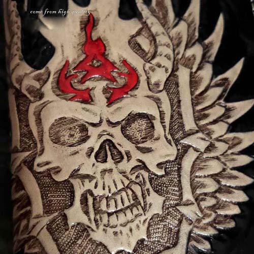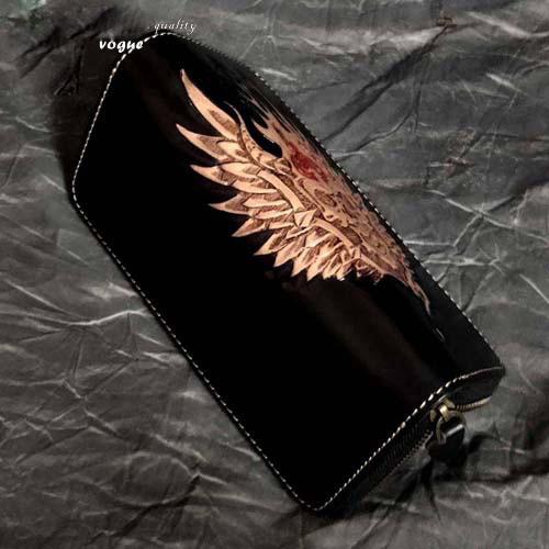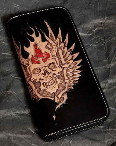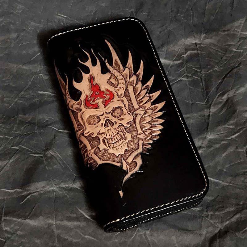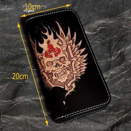 Design: Badass Black Leather Men's Long Biker Handmade Wallet Ghost Skull Tooled Zipper Long Wallets For Men
