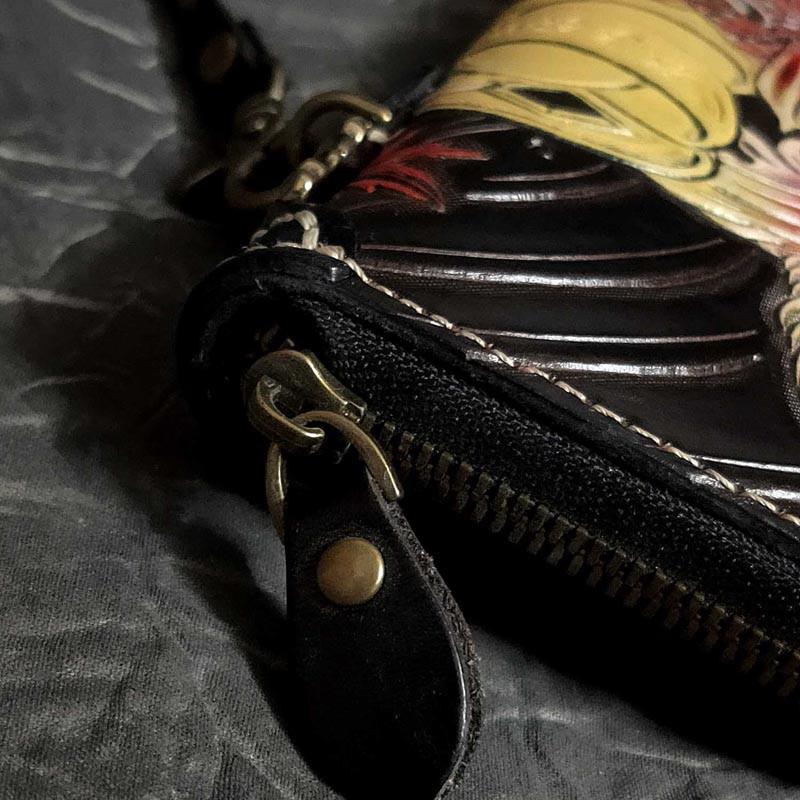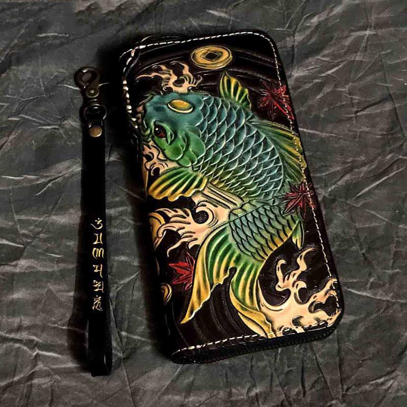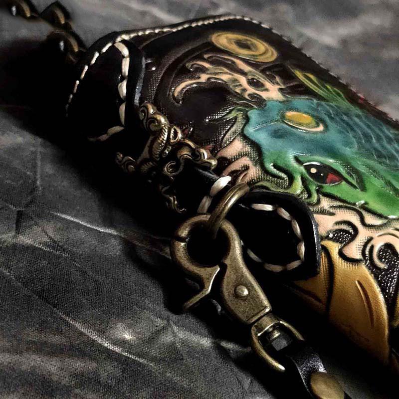 Style: Badass Black Handmade Leather Men's Long Biker Wallet Coffee Tooled Carp Zipper Chain Wallets For Men