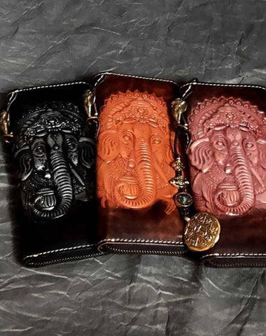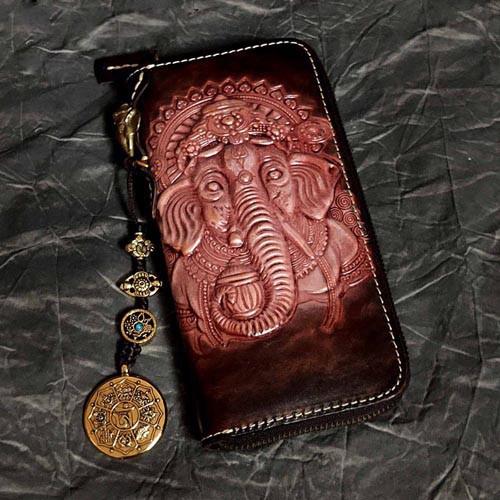 Style: Badass Black Leather Men's Long Biker Handmade Wallet Ganesha Tooled Zipper Chain Long Wallets For Men