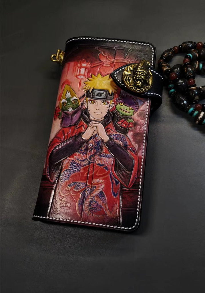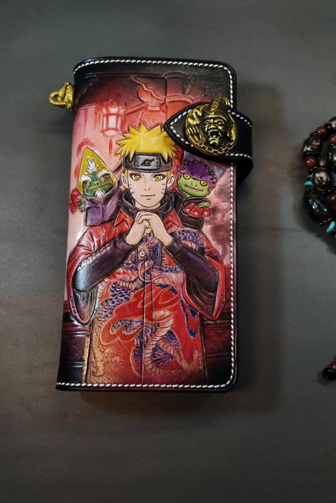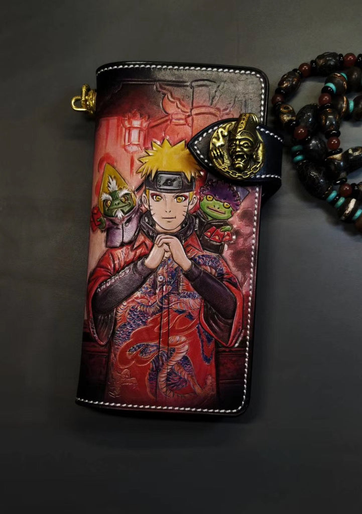 Design: Badass Black Leather Men's Naruto Long Biker Wallet Handmade Tooled Zipper Long Wallets For Men