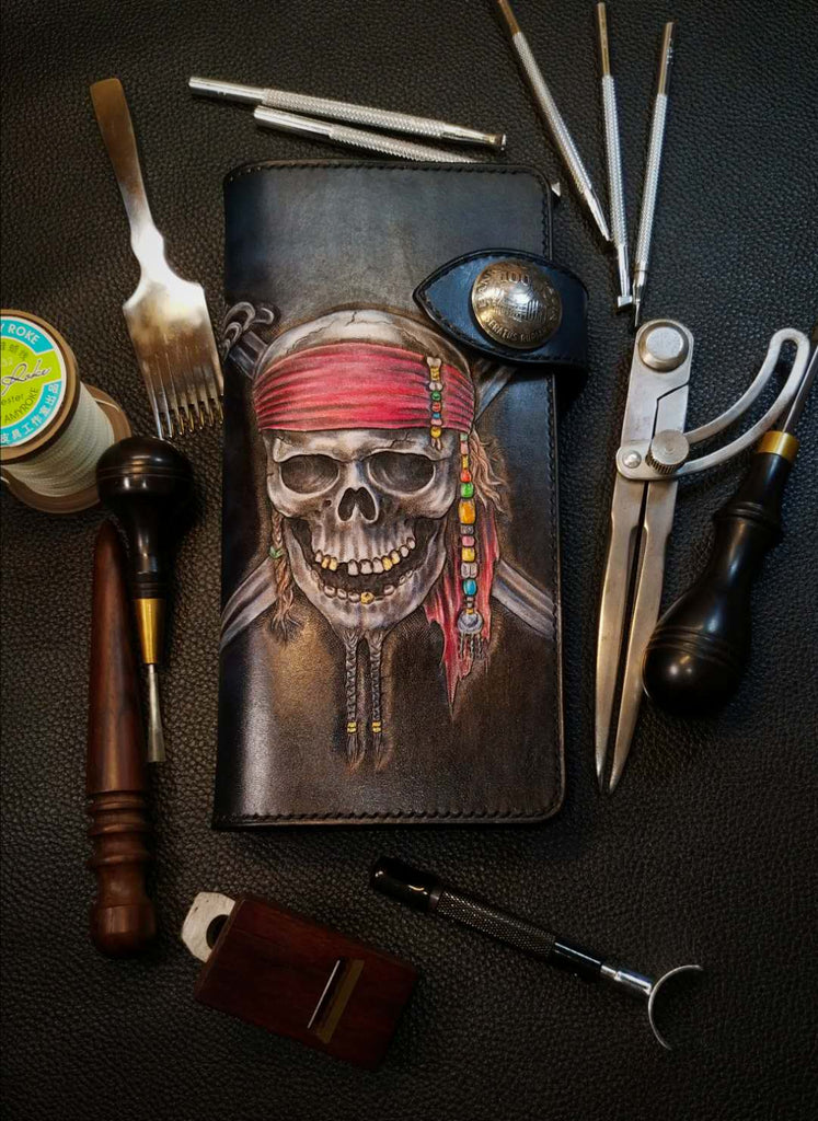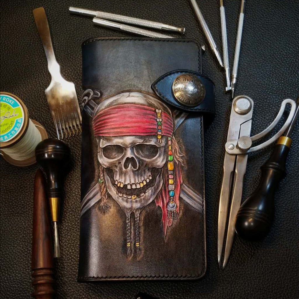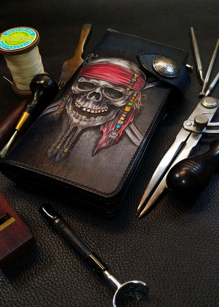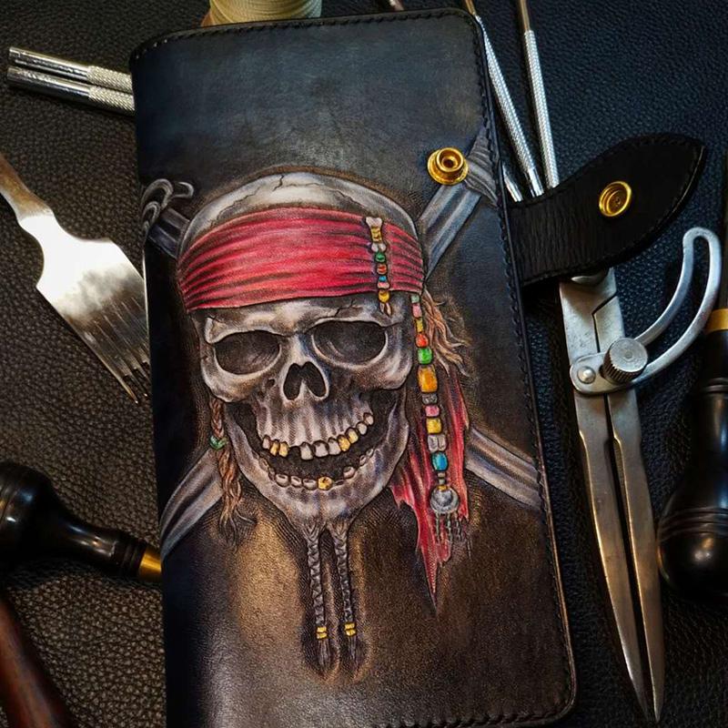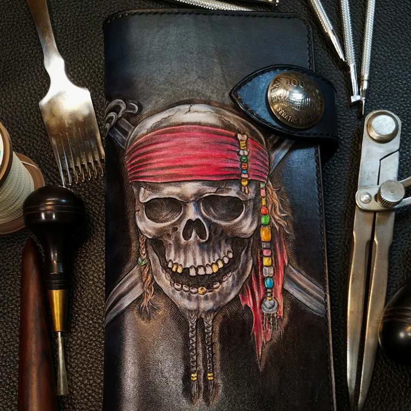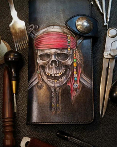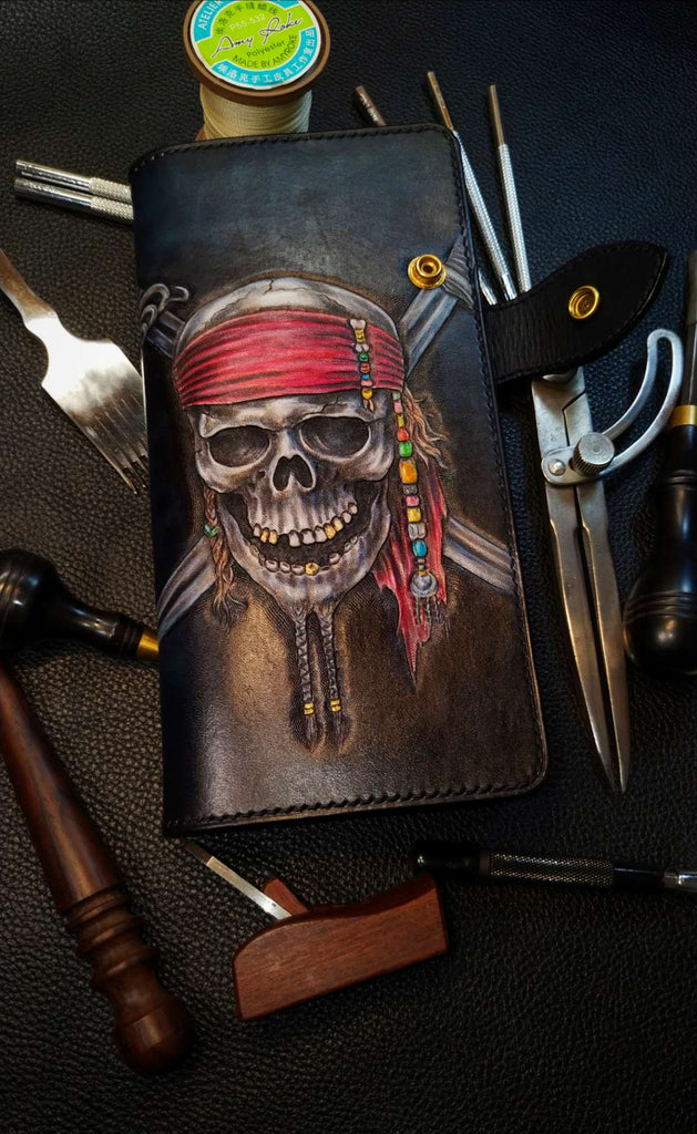 Style: Badass Black Leather Men's Pirate Skull Long Biker Wallet Handmade Tooled Zipper Long Wallets For Men