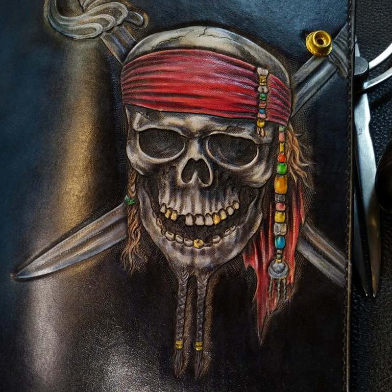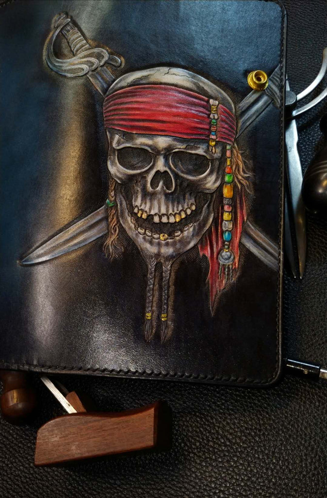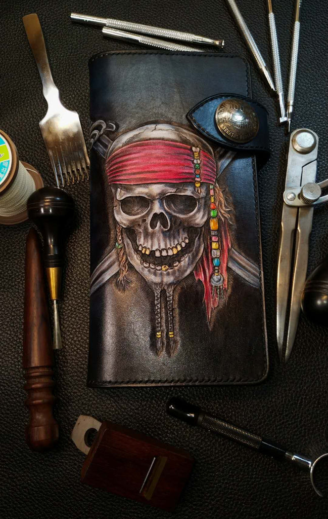 Design: Badass Black Leather Men's Pirate Skull Long Biker Wallet Handmade Tooled Zipper Long Wallets For Men