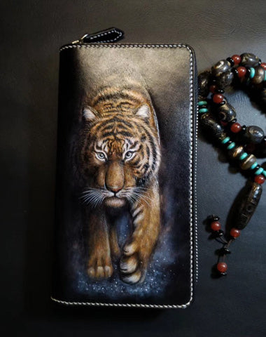 Design: Badass Black Leather Men's Tiger Long Biker Wallet Handmade Tooled Zipper Long Wallets For Men
