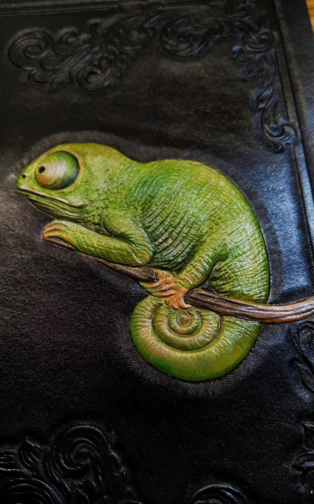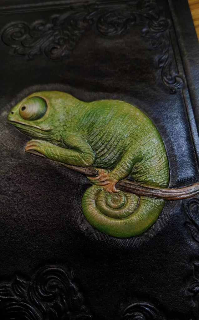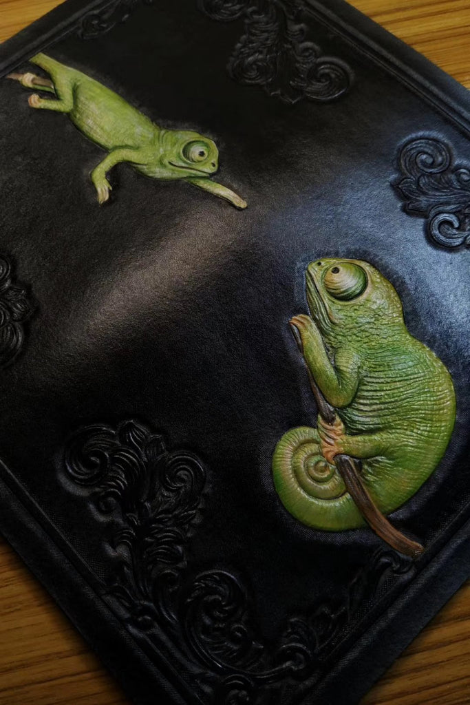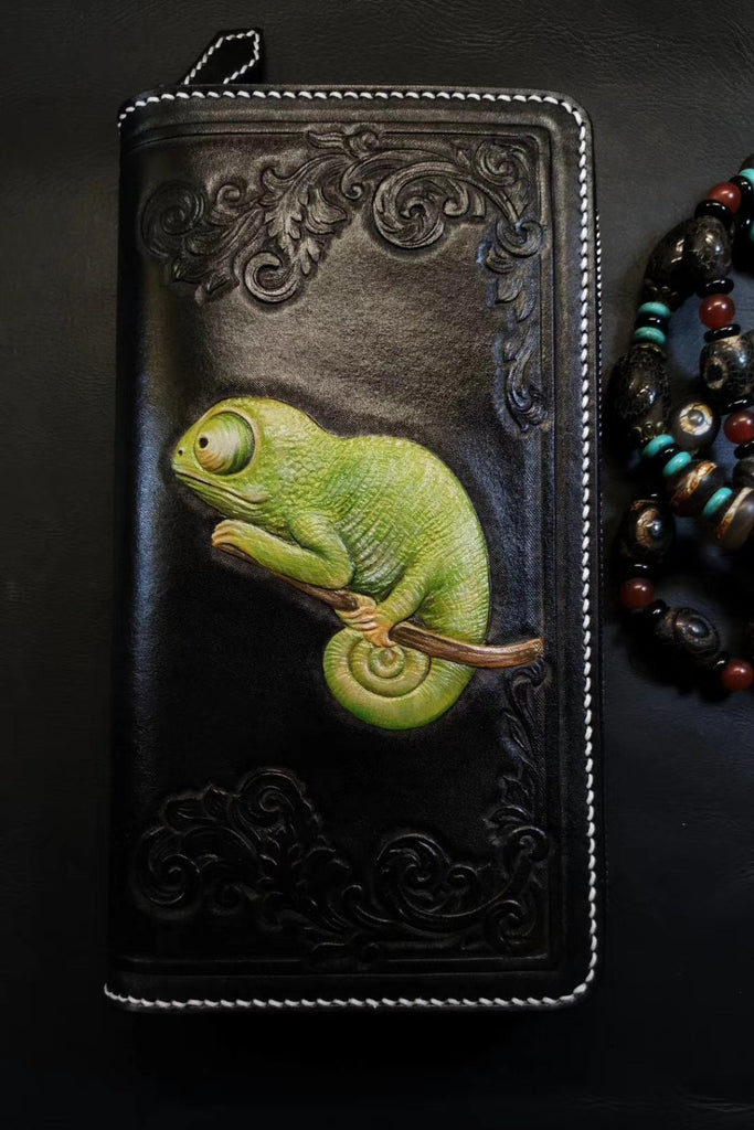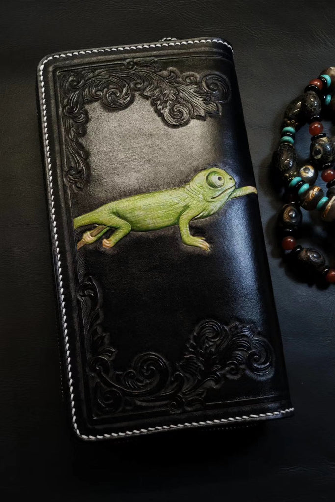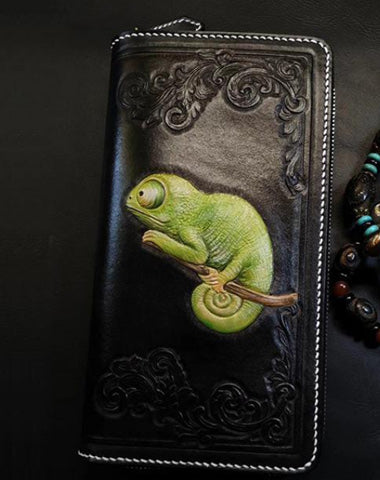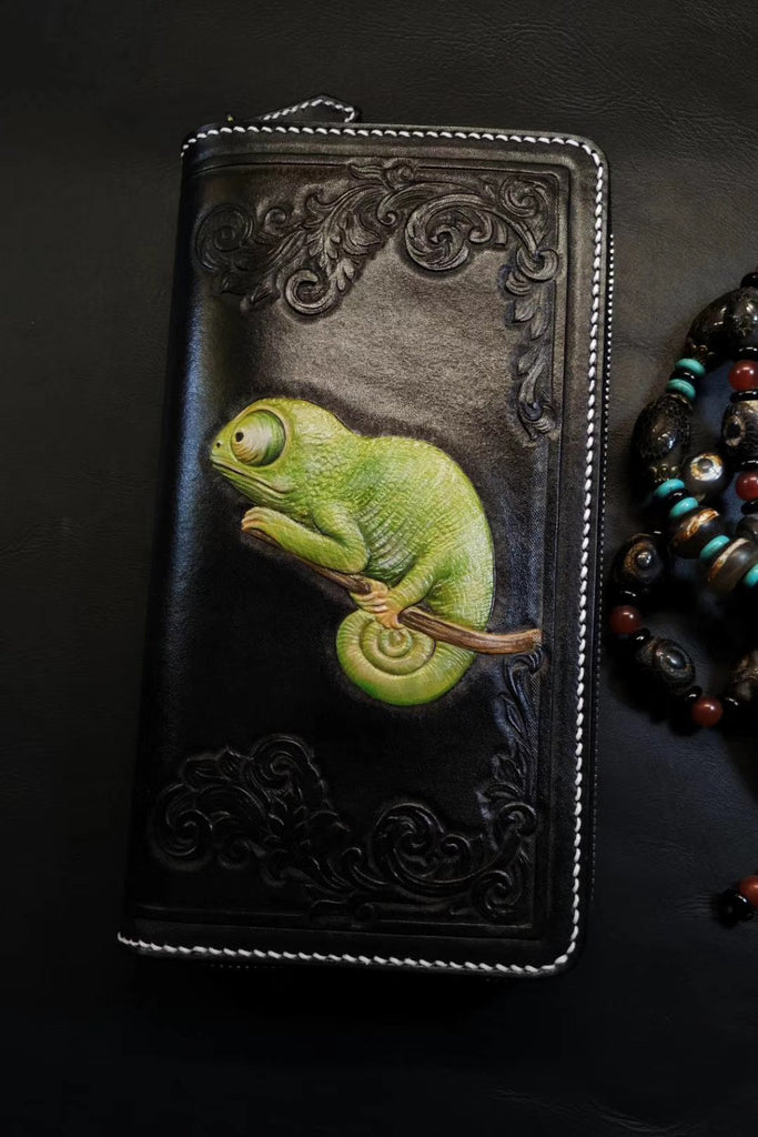 Design: Badass Black Leather Men's Chameleon Biker Wallet Handmade Tooled Zipper Long Wallets For Men