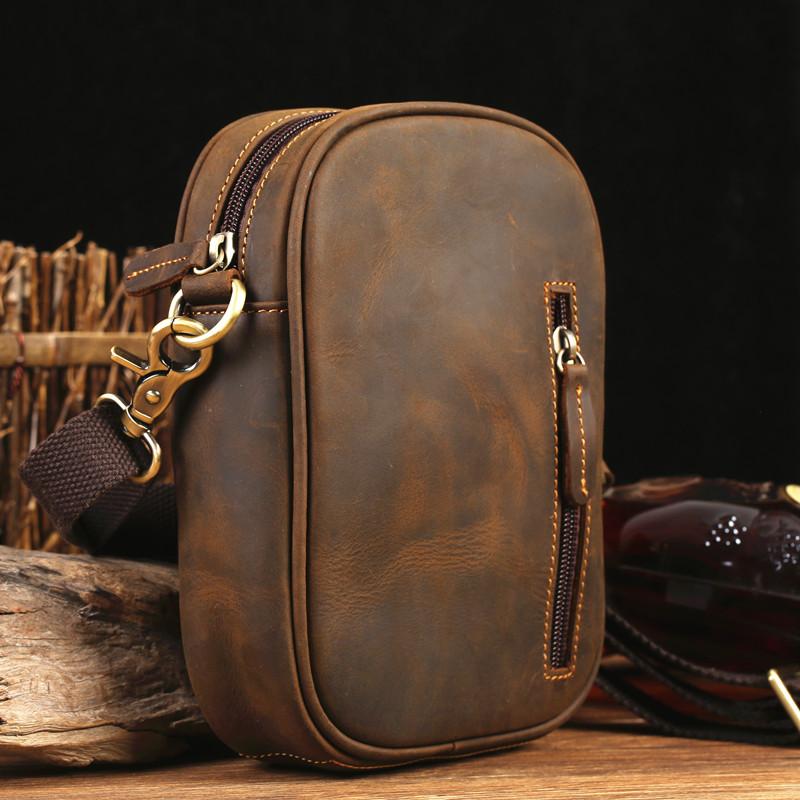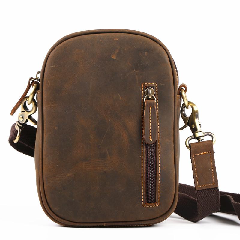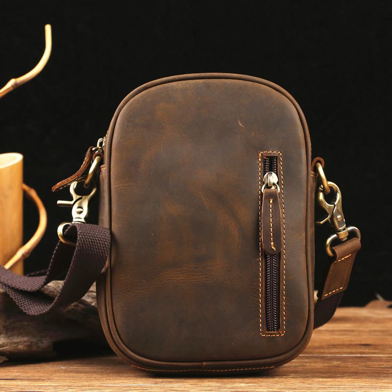 Design: Badass Brown Leather Men's 8 inches Sling Bag Chest Bag One shoulder Backpack Phone Bag For MenOverview: