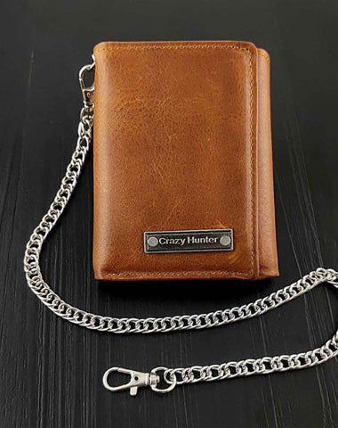 Design: BADASS BROWN LEATHER MENS TRIFOLD SMALL BIKER WALLETS CHAIN WALLET WALLET WITH CHAINS FOR MEN