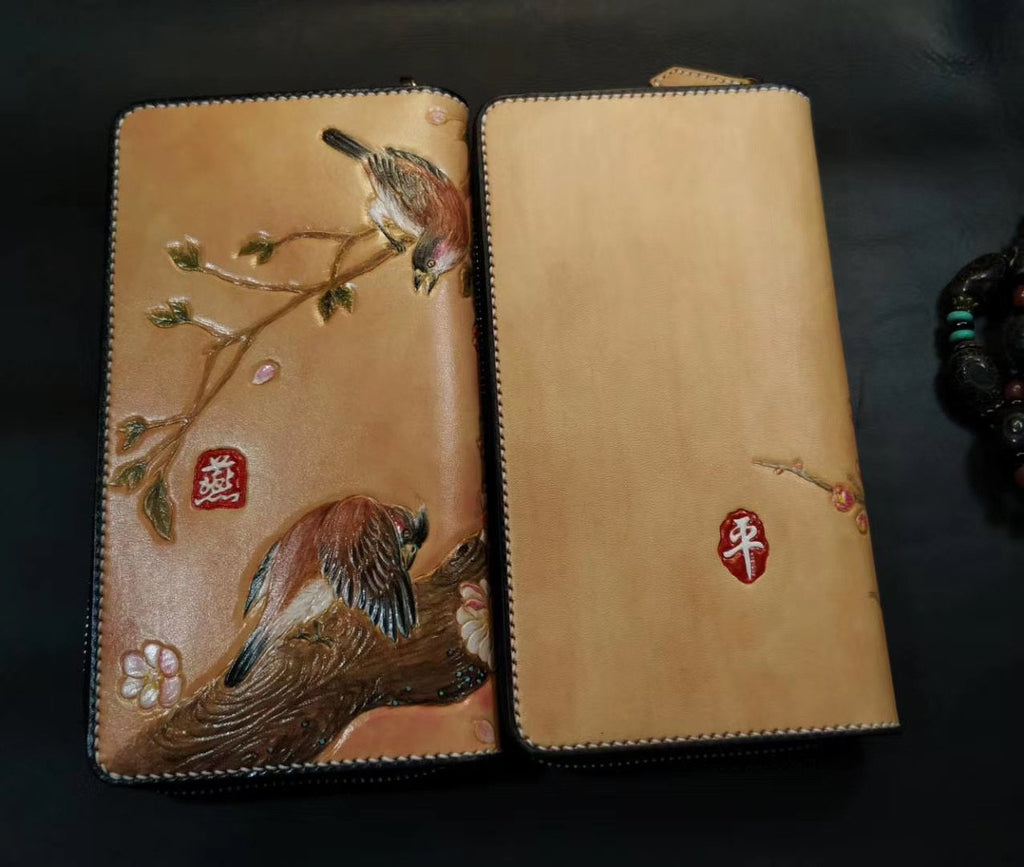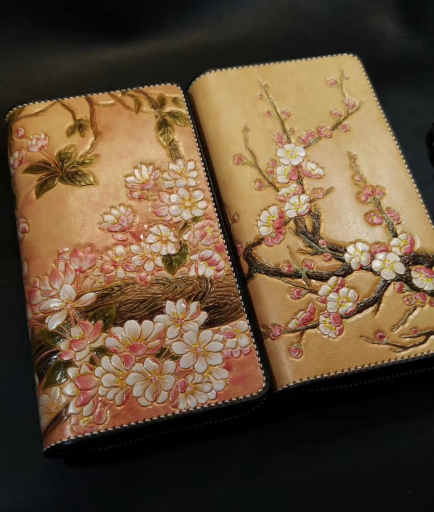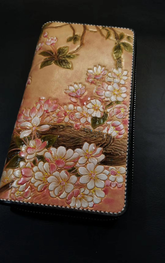 Design: Badass Light Brown Leather Men's Cherry Blossom Tree Biker Wallet Handmade Tooled Zipper Long Wallets For Men
