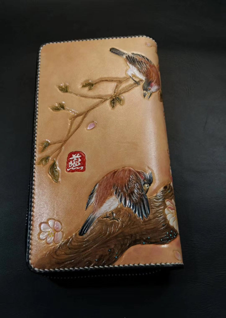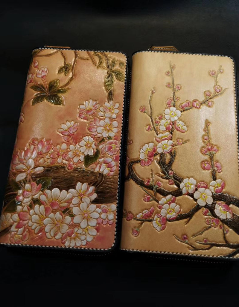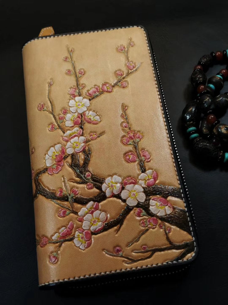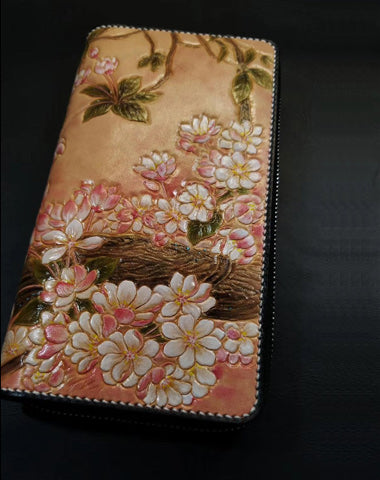 Style: Badass Light Brown Leather Men's Cherry Blossom Tree Biker Wallet Handmade Tooled Zipper Long Wallets For Men