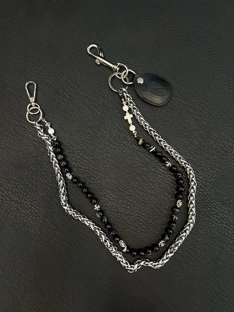 Discover the extraordinary Ball Wallet Chain that redefines alternative accessories through its sophisticated dual-chain construction. This 78cm masterpiece combines two distinct chains in perfect harmony: a primary strand of synthetic obsidian beads alternating with white cross pendants, paired with a secondary chain of intricately woven alloy links. This unique beaded Wallet Chain creates a striking balance between edgy aesthetics and refined craftsmanship, making it an essential statement piece for those who dare to stand out.