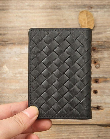 Black Braided Leather Mens Small Wallets Bifold Slim Front Pocket Wallet Card Holder for Men