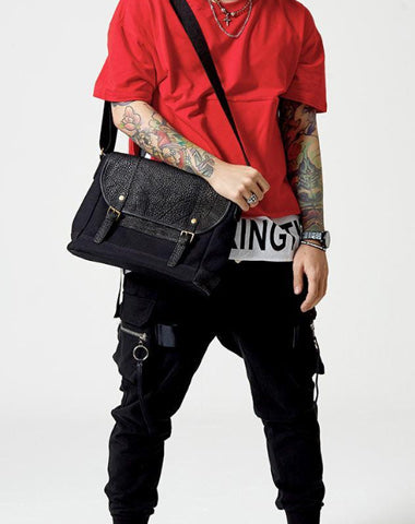 Style: Black Canvas Leather Mens Side Bag Messenger Bags Dark Brown Canvas Courier Bag for Men