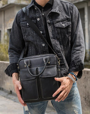 Style: Black Casual Leather Mens 10 inches Side Bags Postman Bag Black Messenger Bag Courier Bag for Men