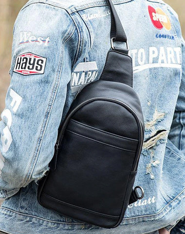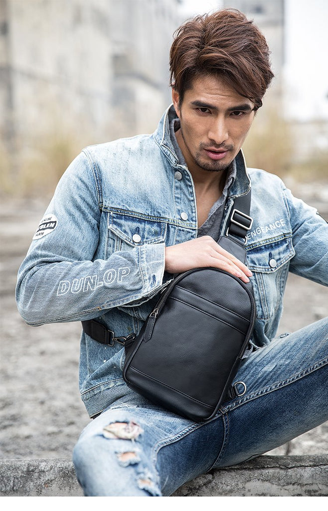 Style: Black Casual Leather Mens 8inches Sling Bag Chest Bags Black One Shoulder Backpack for Men