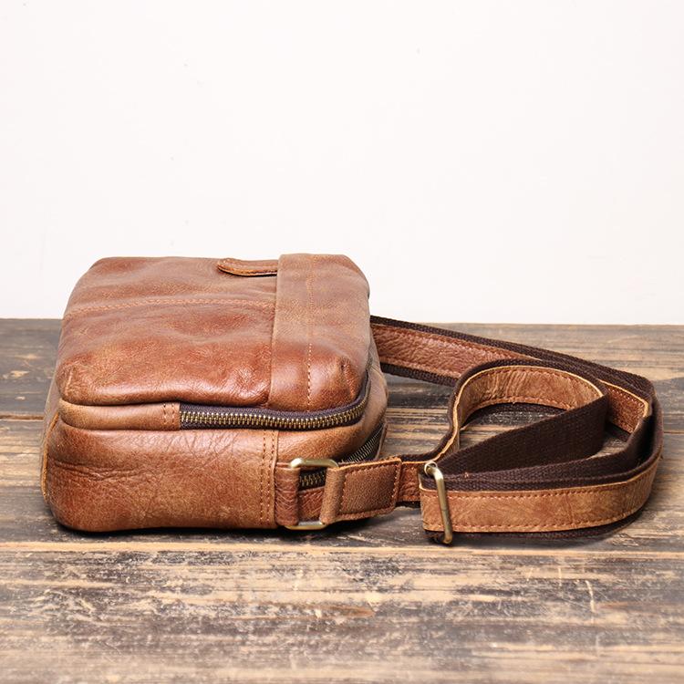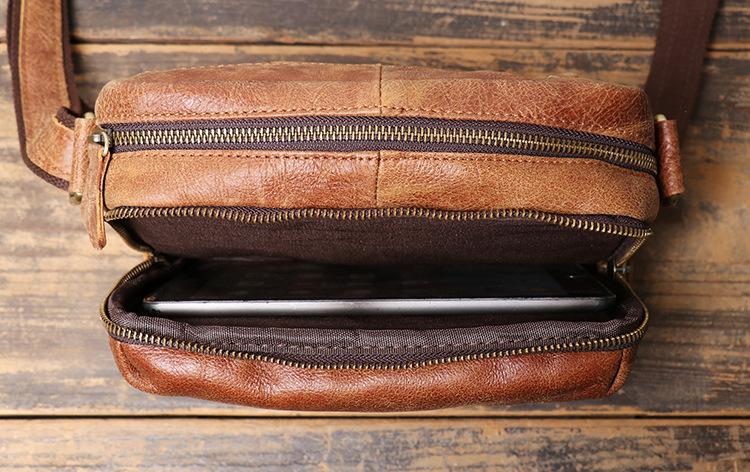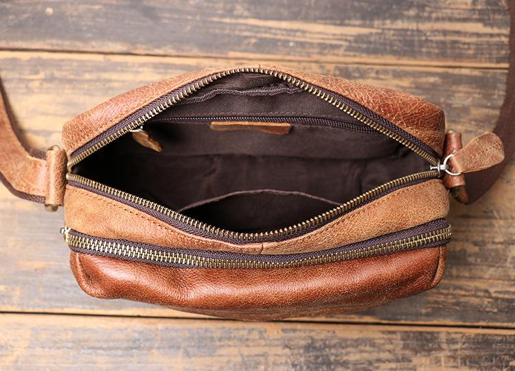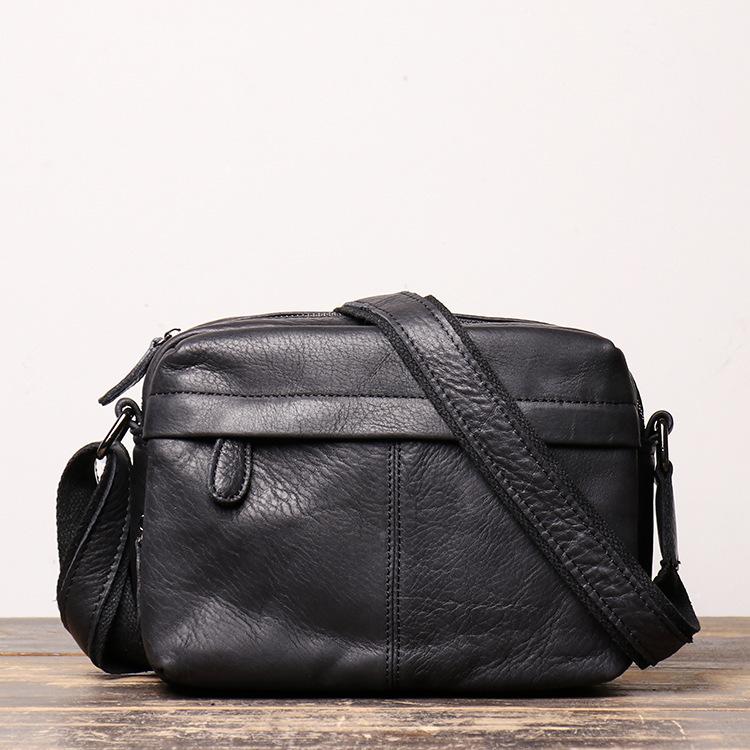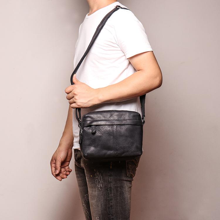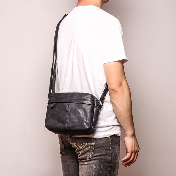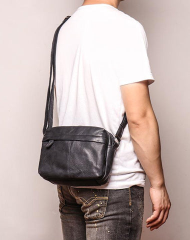 Design: Black Cool Leather 8 inches Small Zipper Messenger Bag Shoulder Bag Brown Side Bag For Men