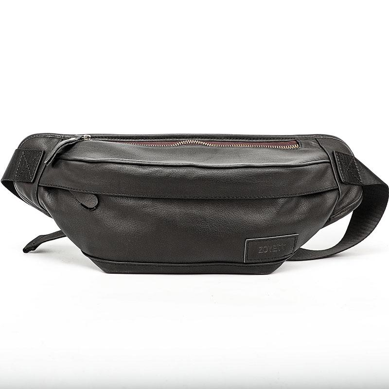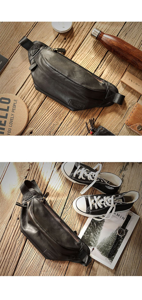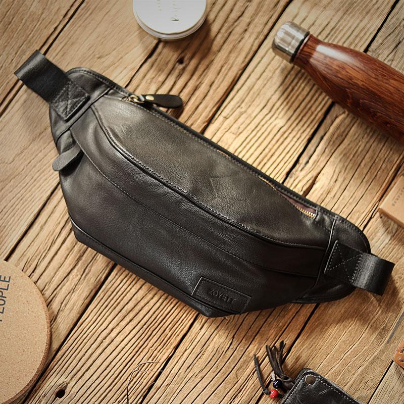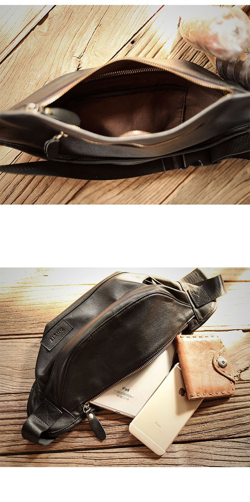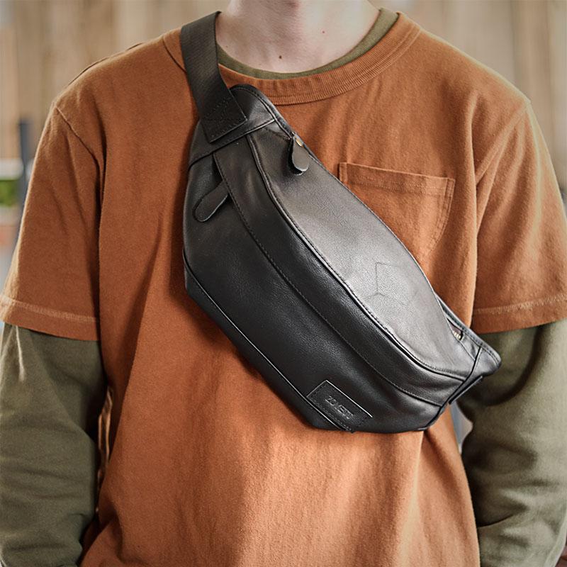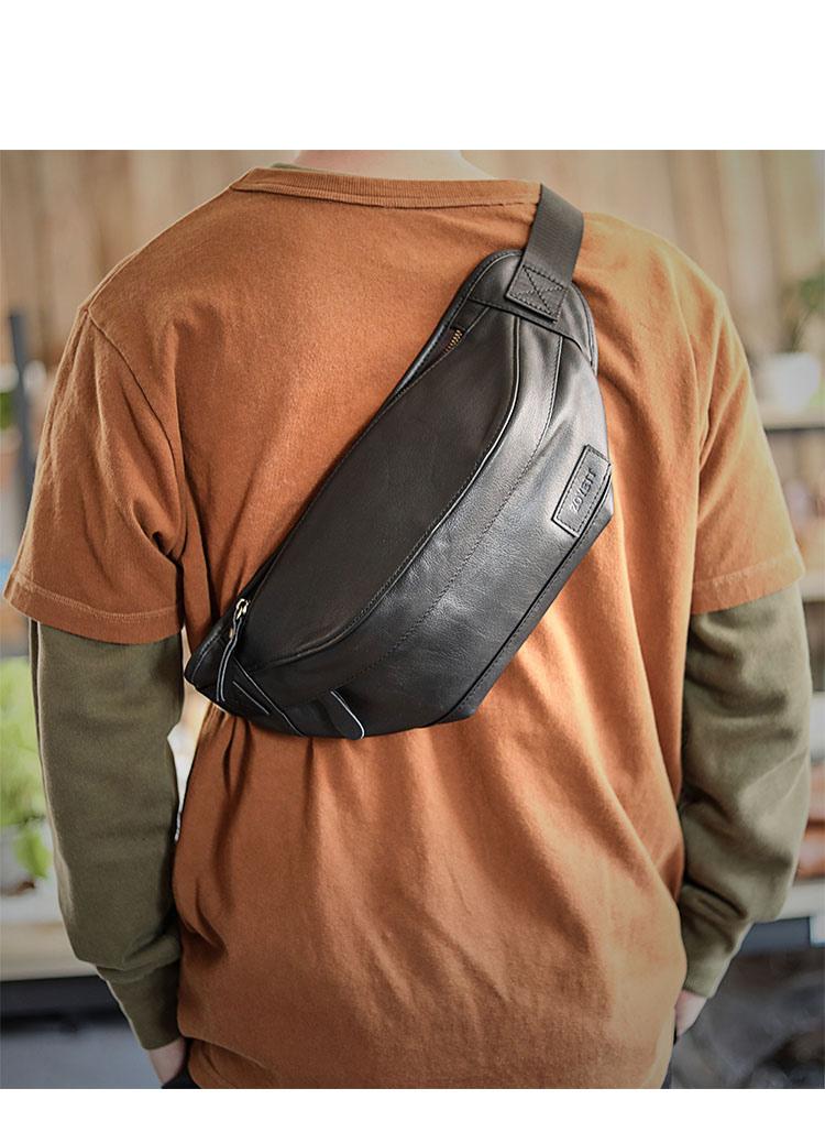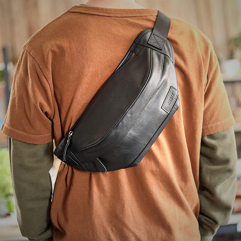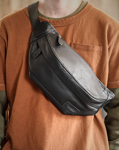 Design: Black Cool Leather Mens Chest Bag Waist Bag Fanny Pack Hip Bag Bum Pack For Men