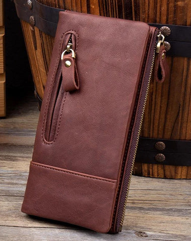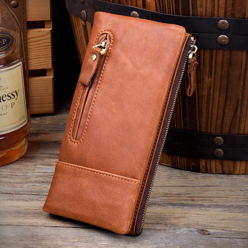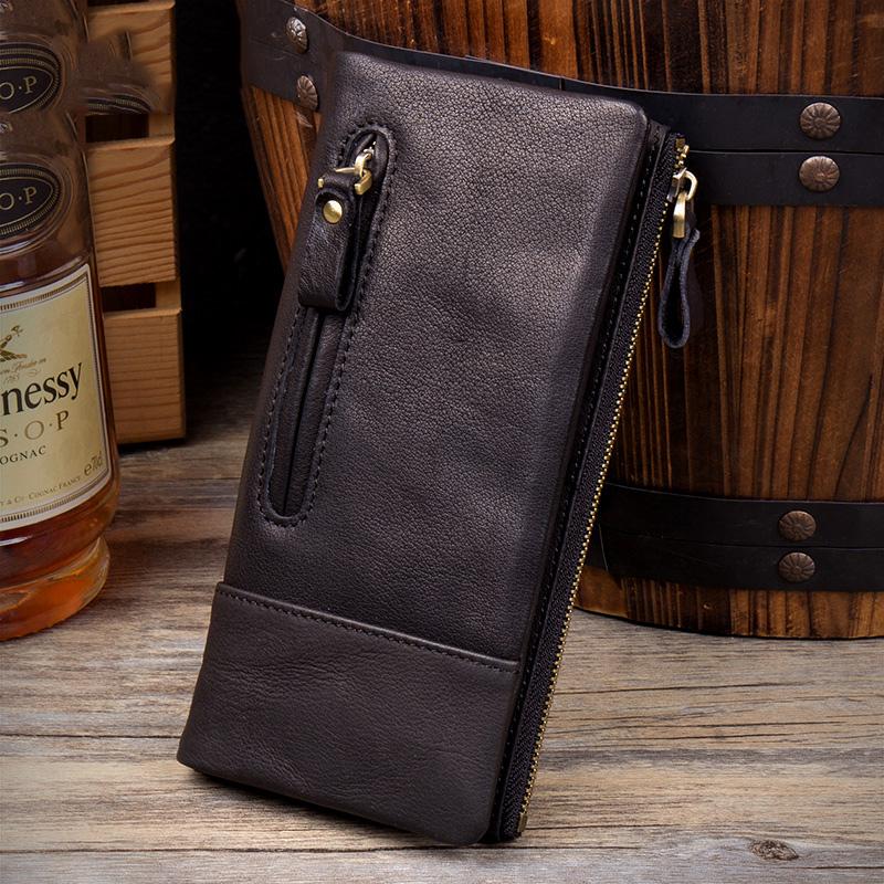Style: Black Cool Mens Leather long Wallet Khaki Leather Zipper Wallet Long Wallets Clutch for Men