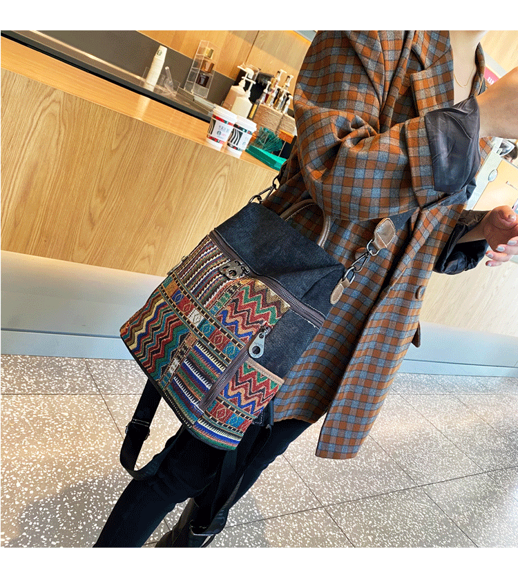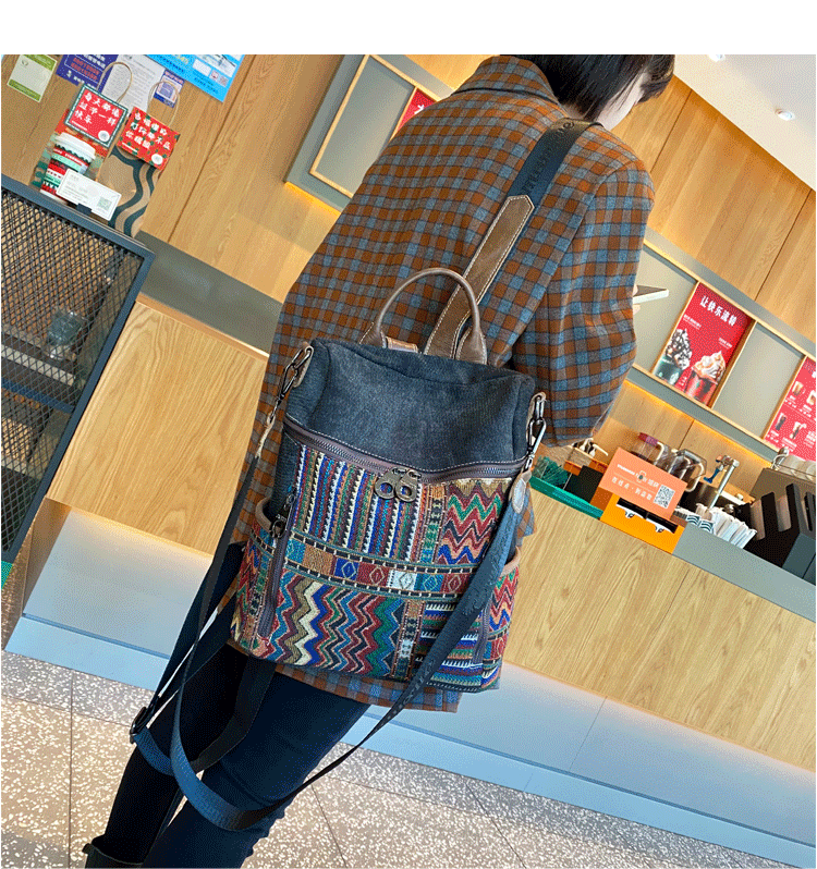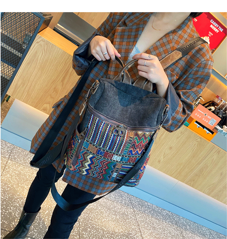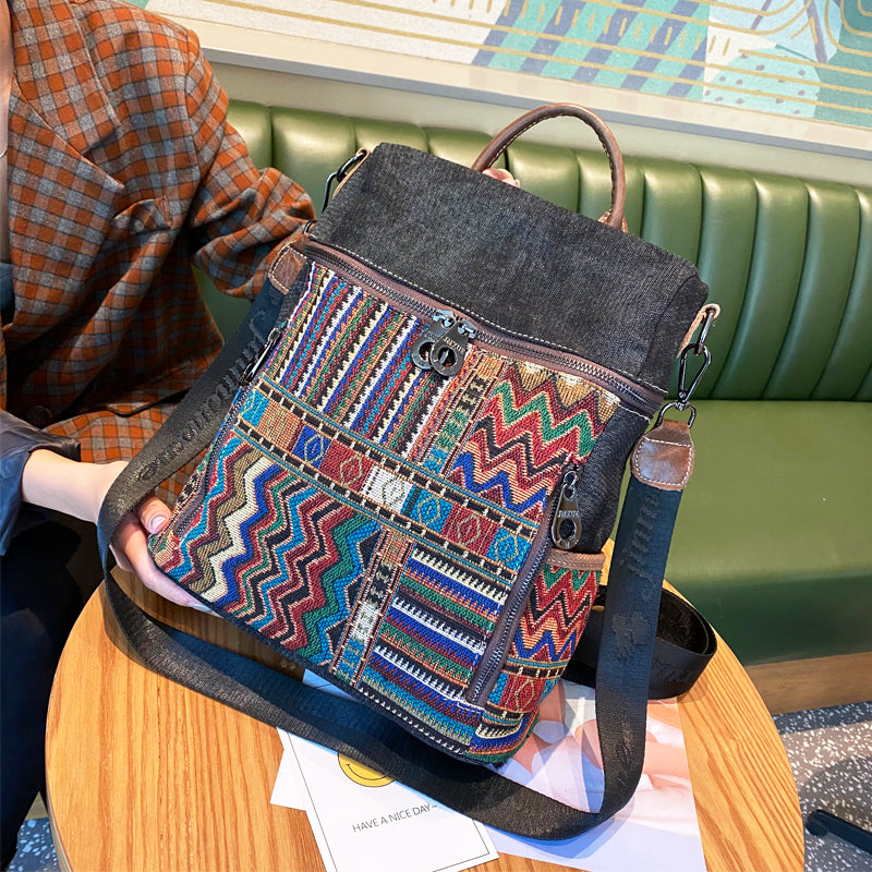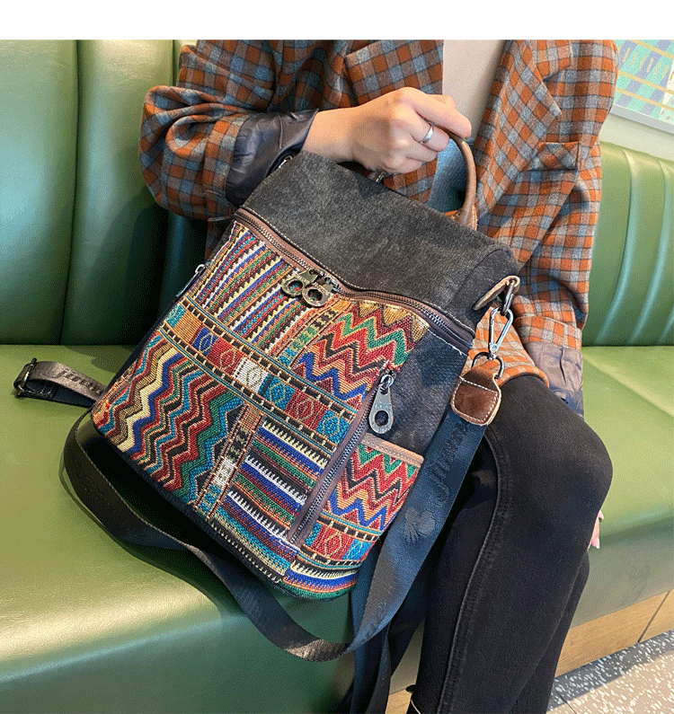Design: Vintage Convertible Large Boho Style Backpack Boho Crossbody Bag Black Gray Embroidery Canvas Backpack
