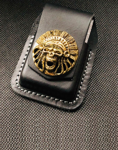 Black Handmade Leather Mens Indian Skull Zippo Lighter Holders Lighter Case For Men
