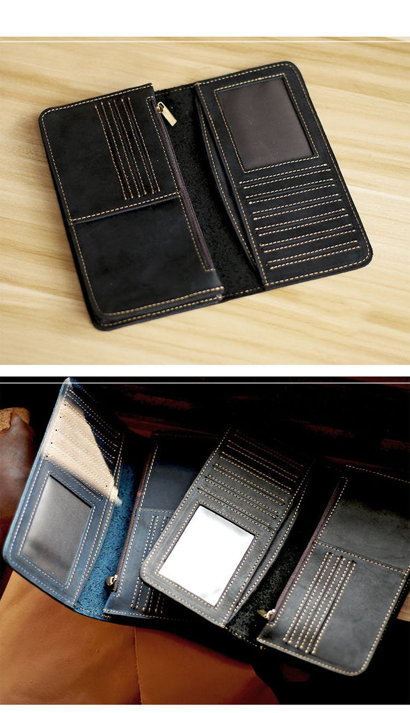Design: Black Handmade Leather Mens Phone Wallet Clutch Bag Wristlet Bag Zipper Long Wallet For Men