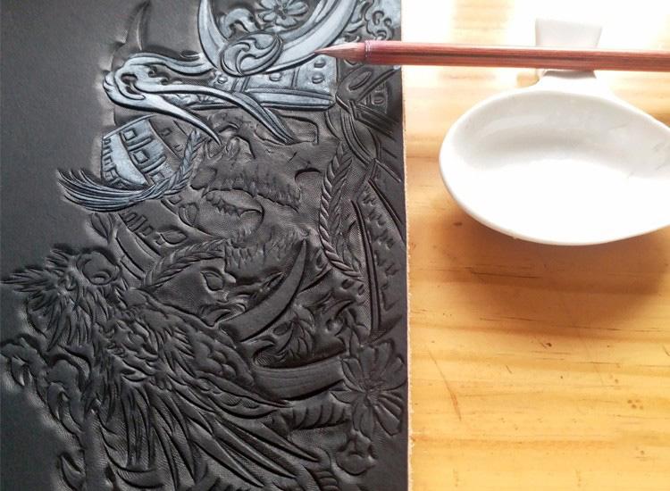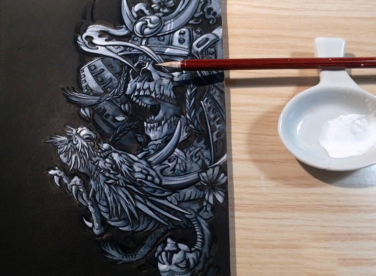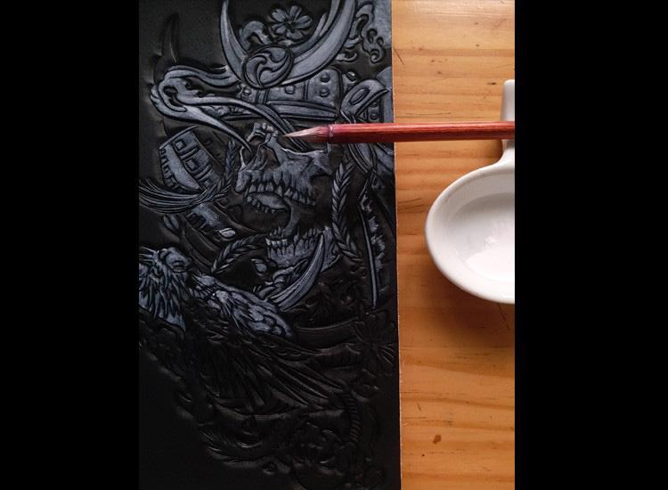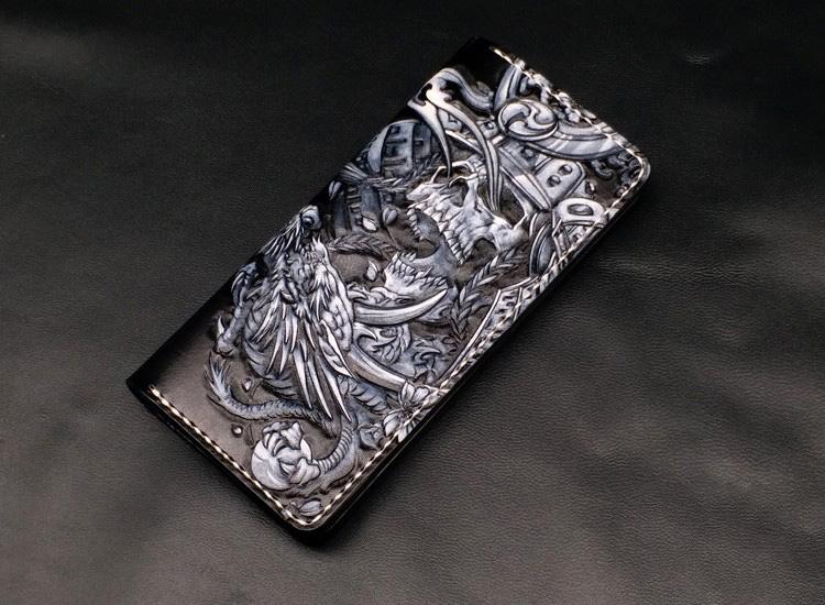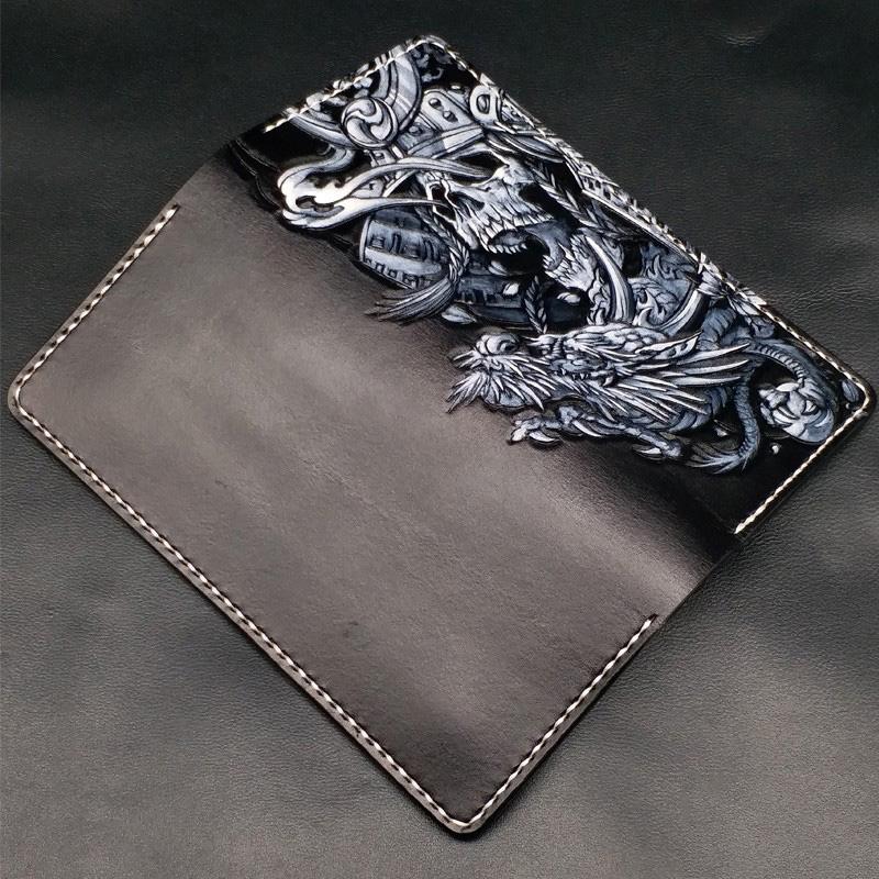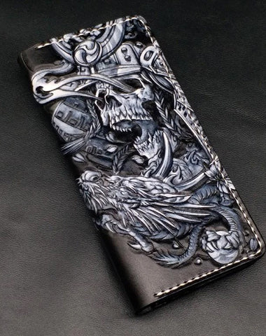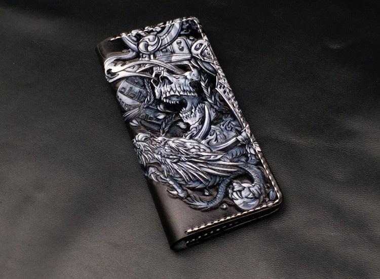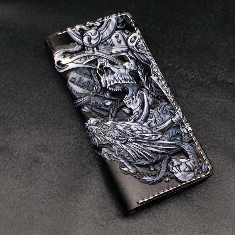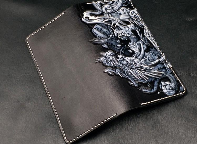 Black Handmade Tooled Japanese Samurai Skull Leather Mens Long Wallet Bifold Long Wallet For Men