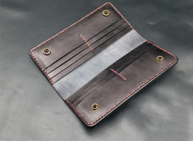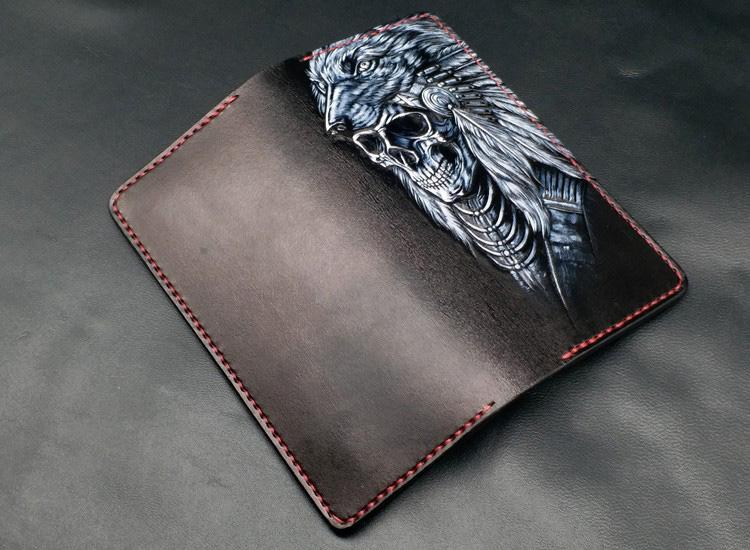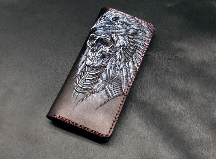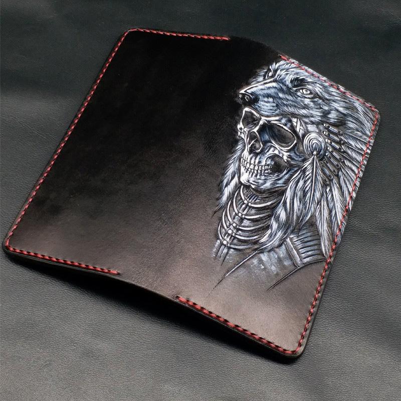 Style: Black Handmade Tooled Indian Chief Skull Leather Mens Long Wallet Bifold Long Wallet For Men