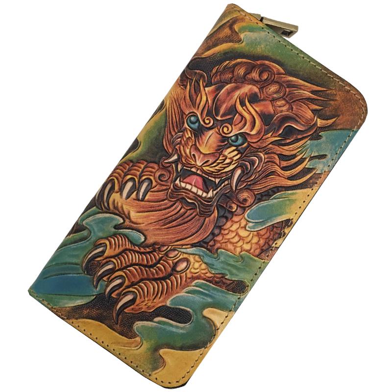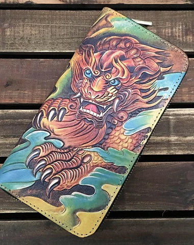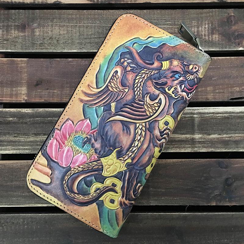 Design: Black Handmade Tooled Tang Lion Leather Long Wallet Zipper Wallet Clutch Wallet For Men
