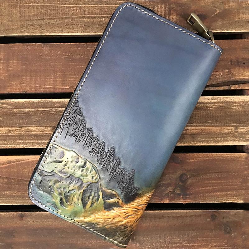 Style: Blue Handmade Tooled Wolf Leather Long Wallet Zipper Wallet Clutch Wallet For Men