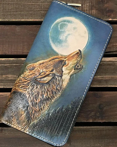 Design: Blue Handmade Tooled Wolf Leather Long Wallet Zipper Wallet Clutch Wallet For Men