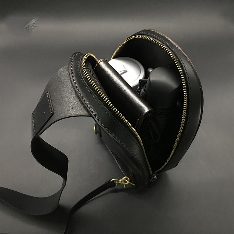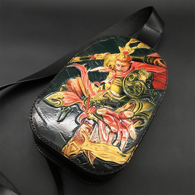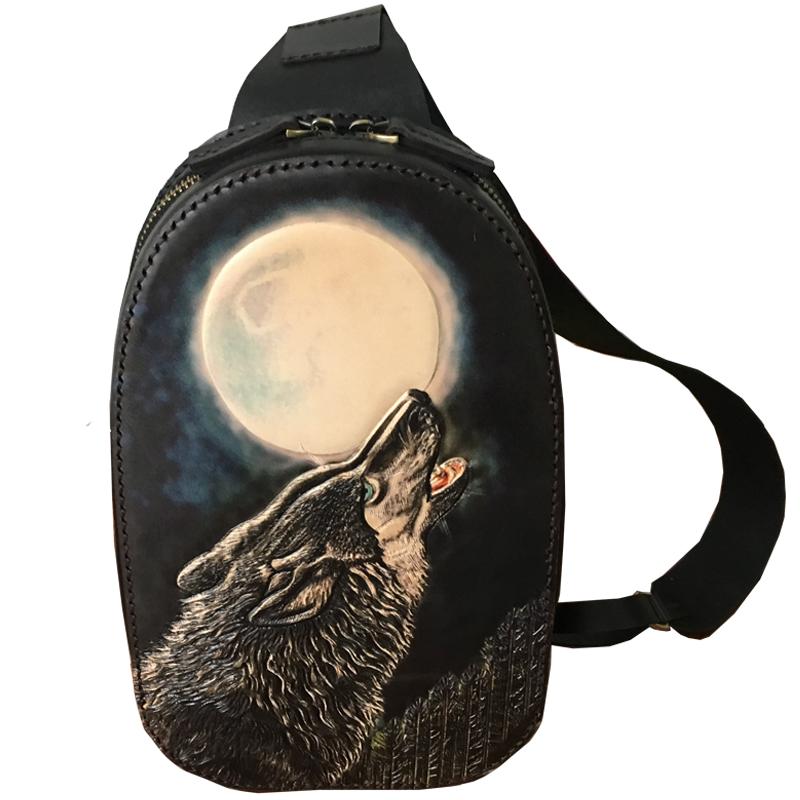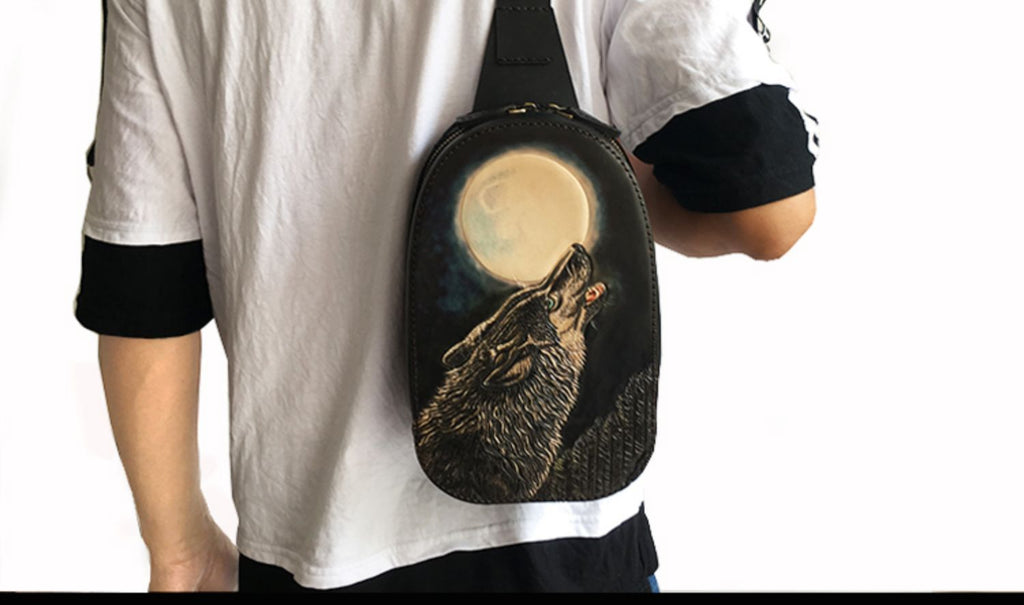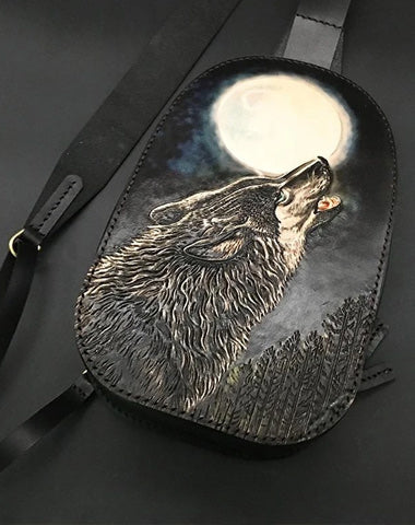 Style: Black Handmade Tooled Leather Sling Bag Chest Bag Wolf One Shoulder Backpack For Men