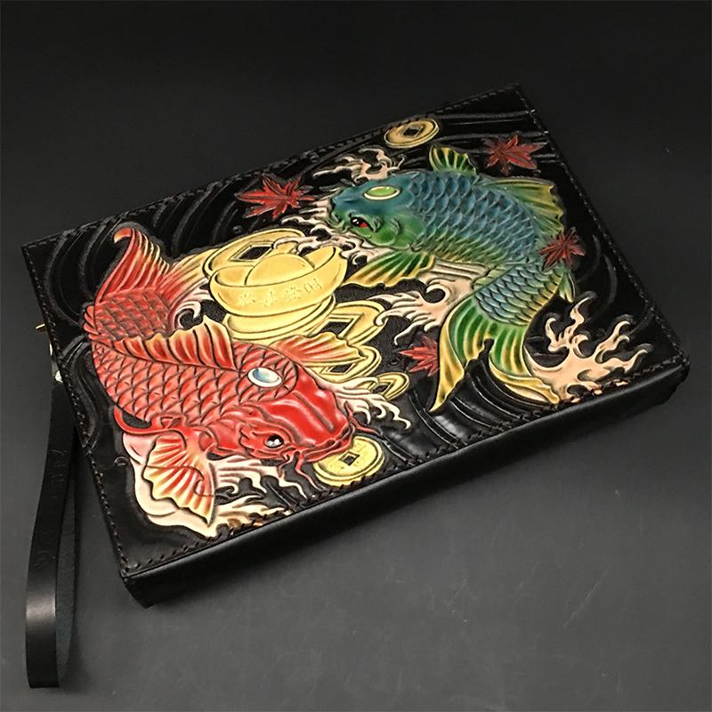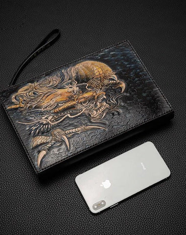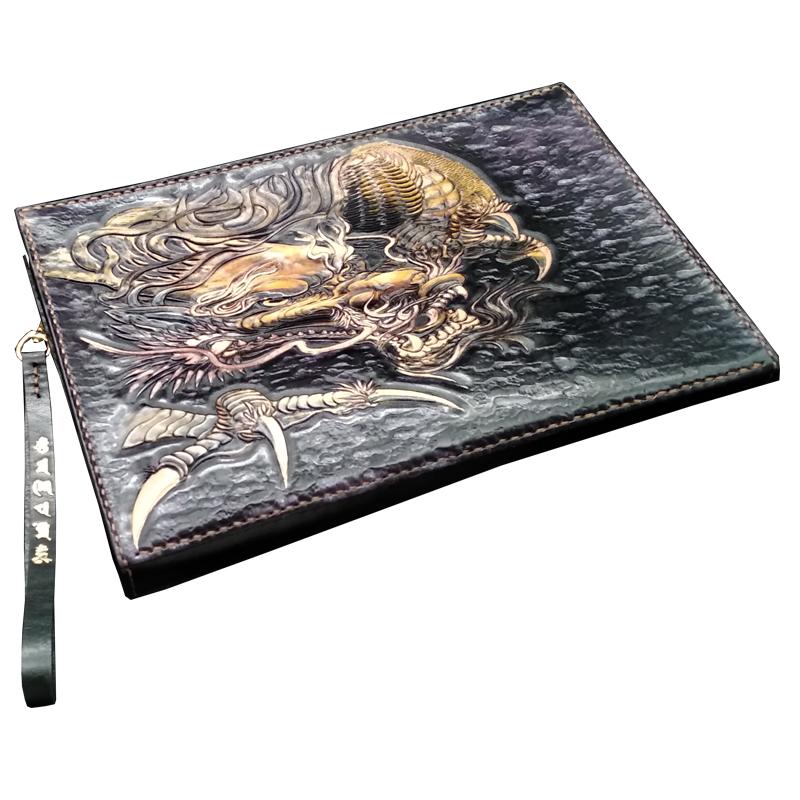 Design: Black Handmade Tooled Leather Chinese DragonClutch Wallet Wristlet Bag Clutch Purse For Men