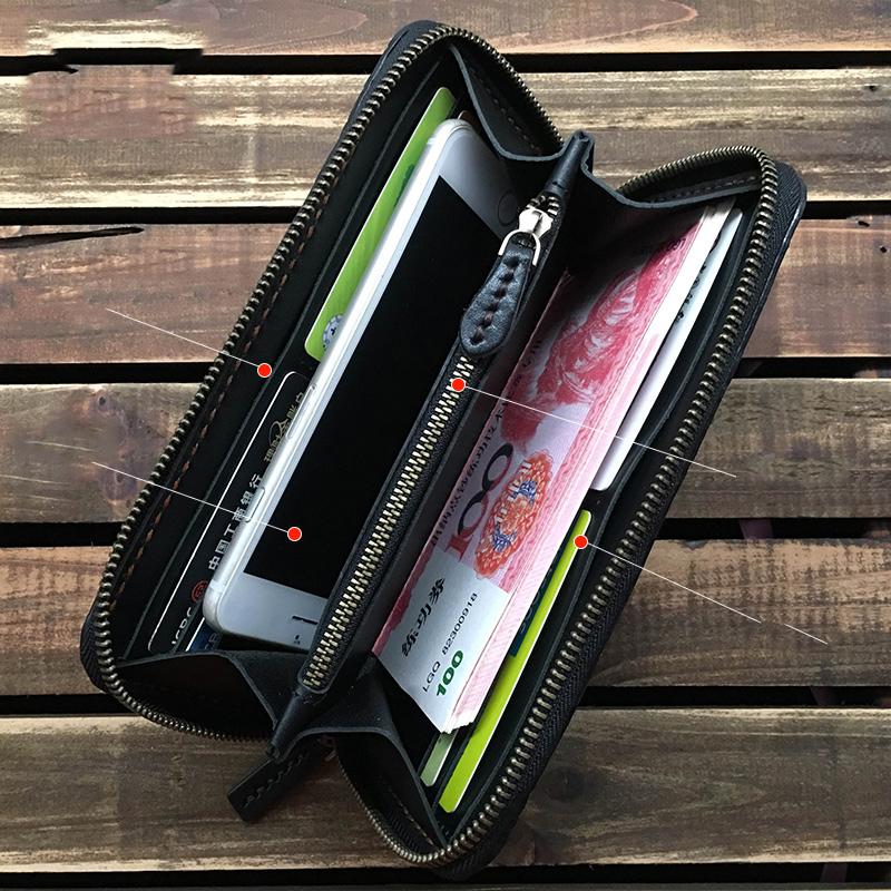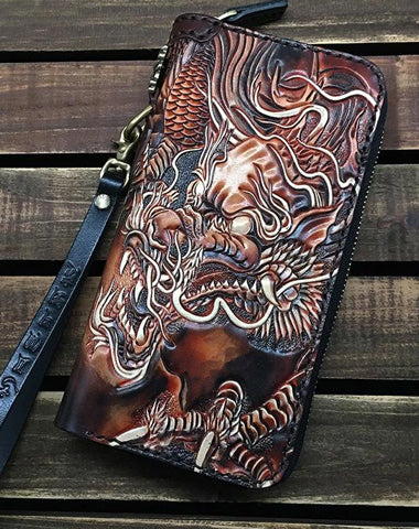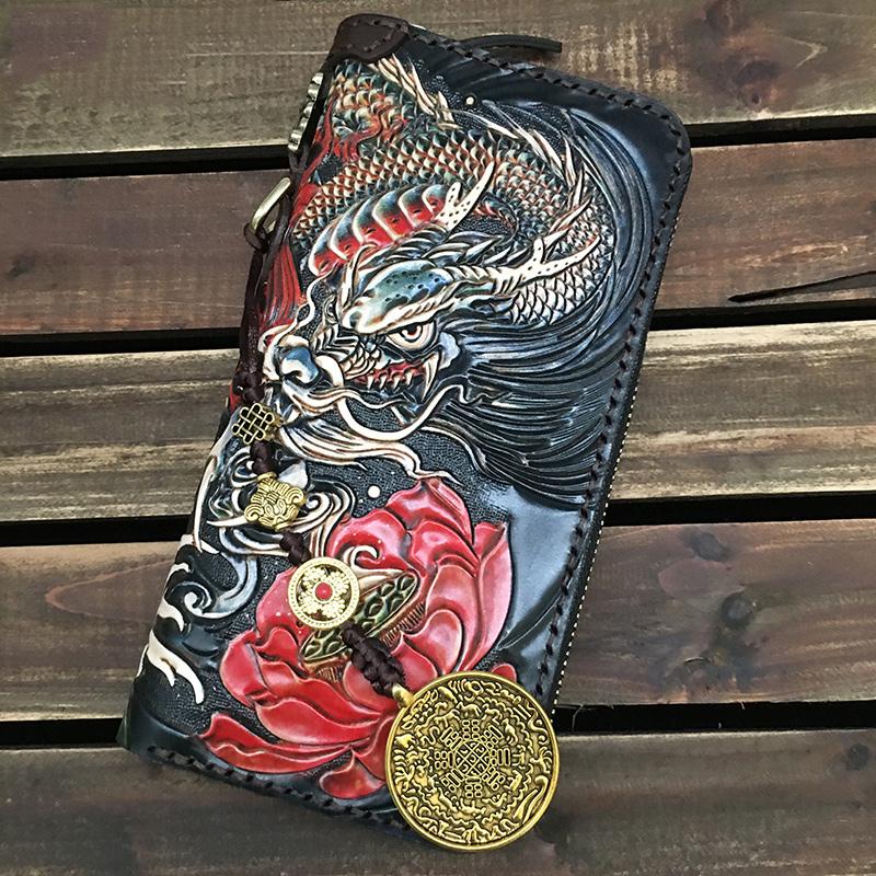 Design: Black Handmade Tooled Chinese Dragon Leather Long Biker Wallet Chain Wallet Clutch Wallet For Men