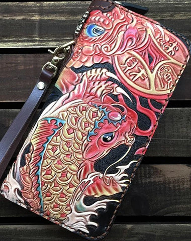 Design: Black Handmade Carp Toad Tooled Leather Long Biker Wallet Black Chain Wallet Clutch Wallet For Men