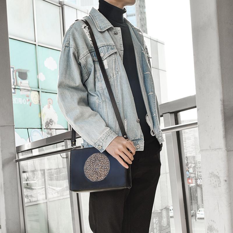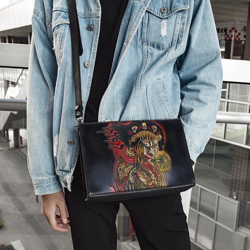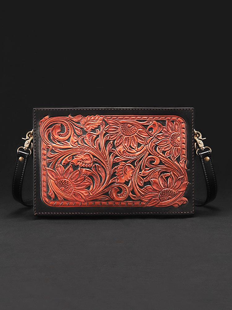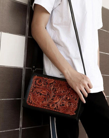 Style: Handmade Black Tooled Floral Leather Messenger Bags Side Bag Clutch Wristlet Bag For Men