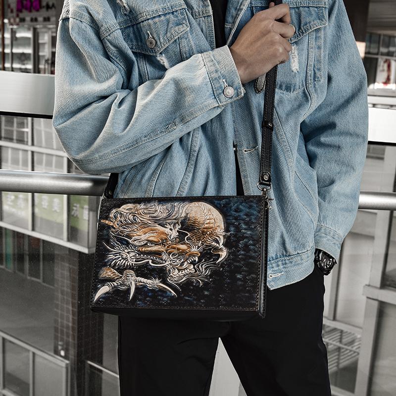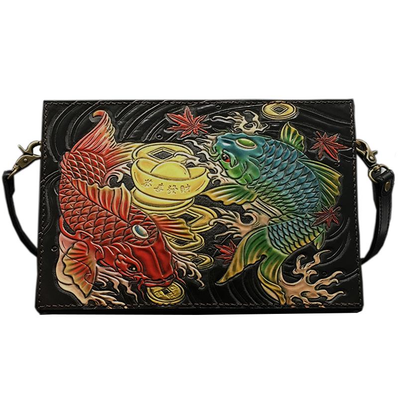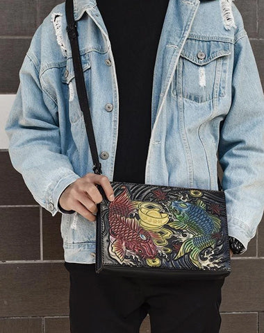 Style: Handmade Black Tooled Double Carp Leather Messenger Bags Side Bag Clutch Wristlet Bag For Men