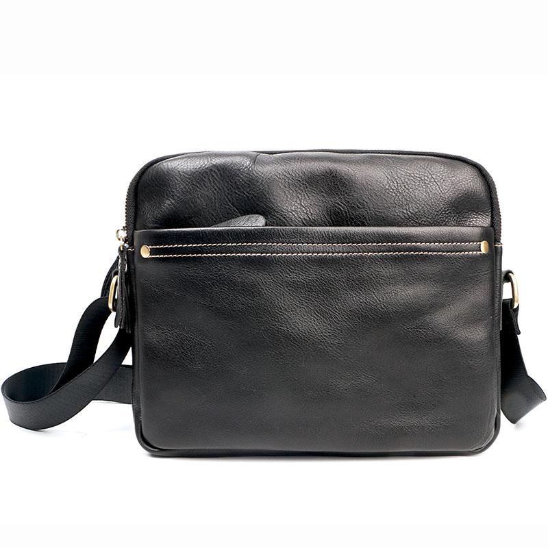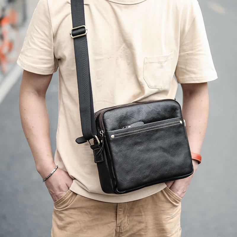 Design: Black Leather Mens 10 inches Crossbody Bag Messenger Bag One Shoulder Bag For Men