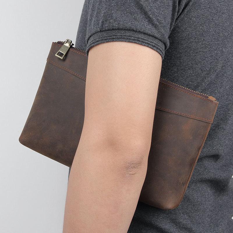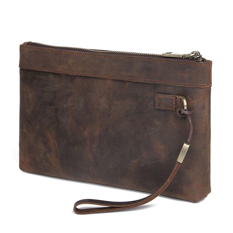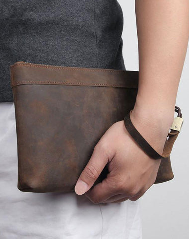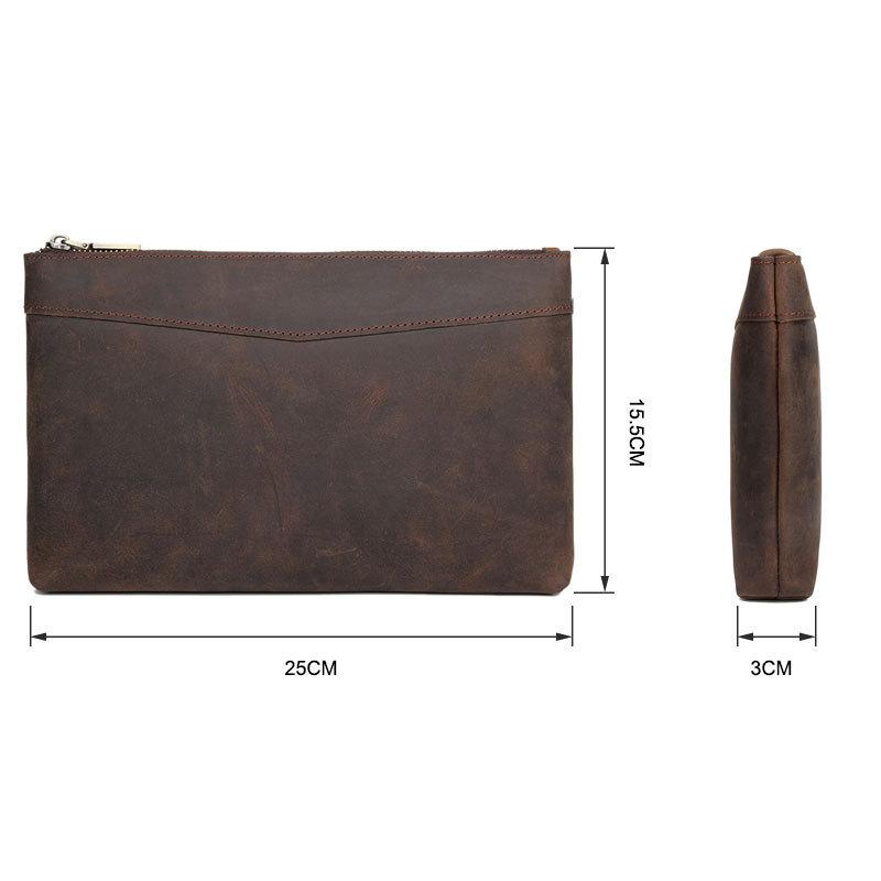 Design: Dark Brown Leather Mens 8 inches Envelope Bag Wristlet Wallet Bag Zipper Clutch Wallet For Men