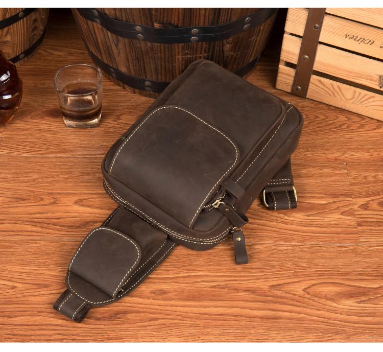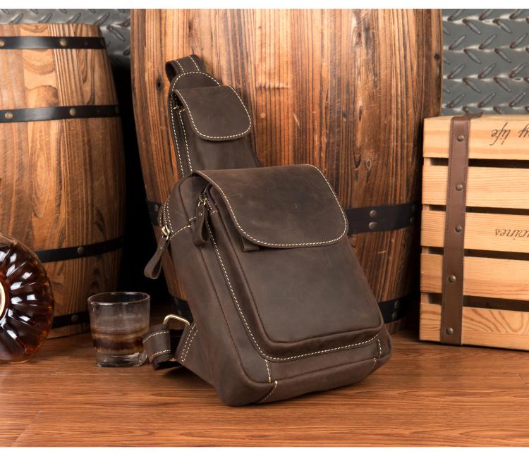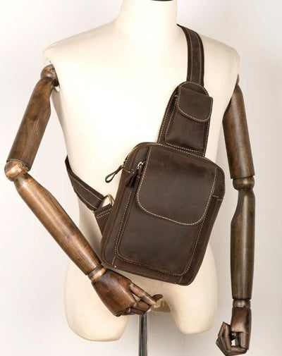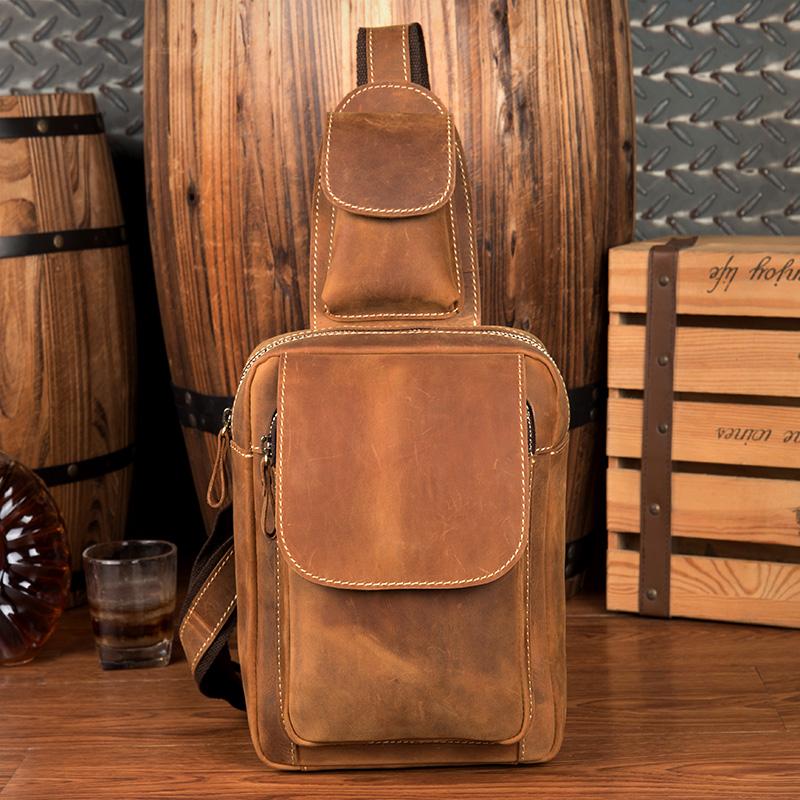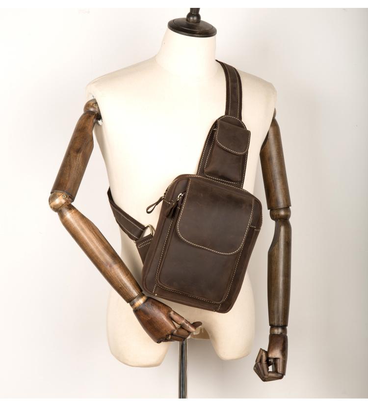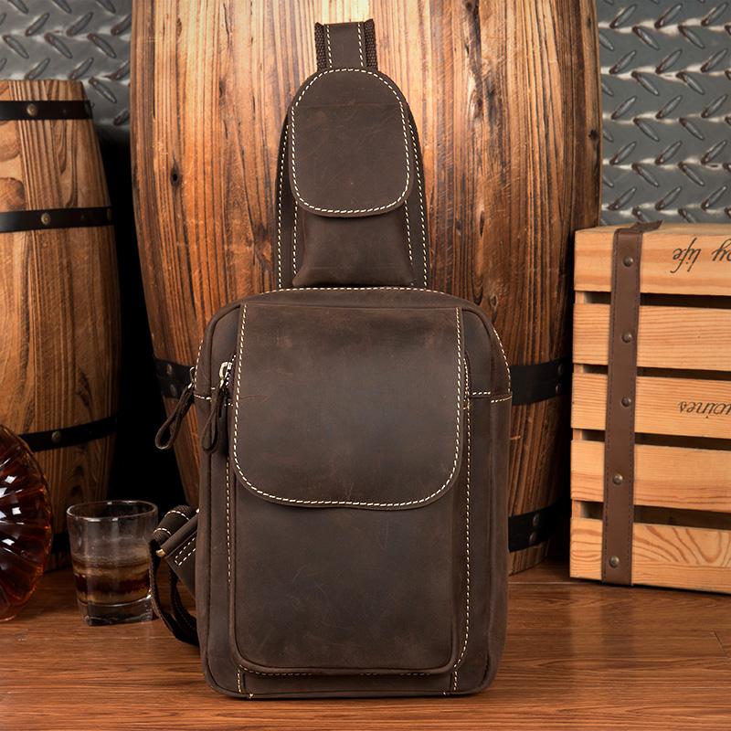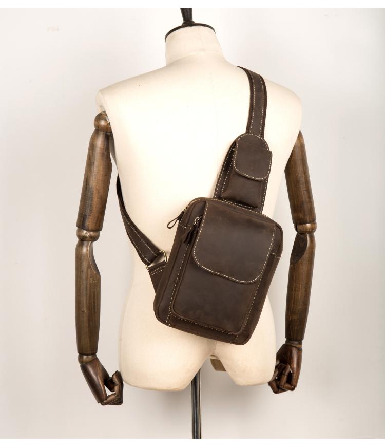 Design: Dark Brown Leather Mens Cool 8 inches Sling Bag Light Brown Crossbody Bag Chest Bag for men