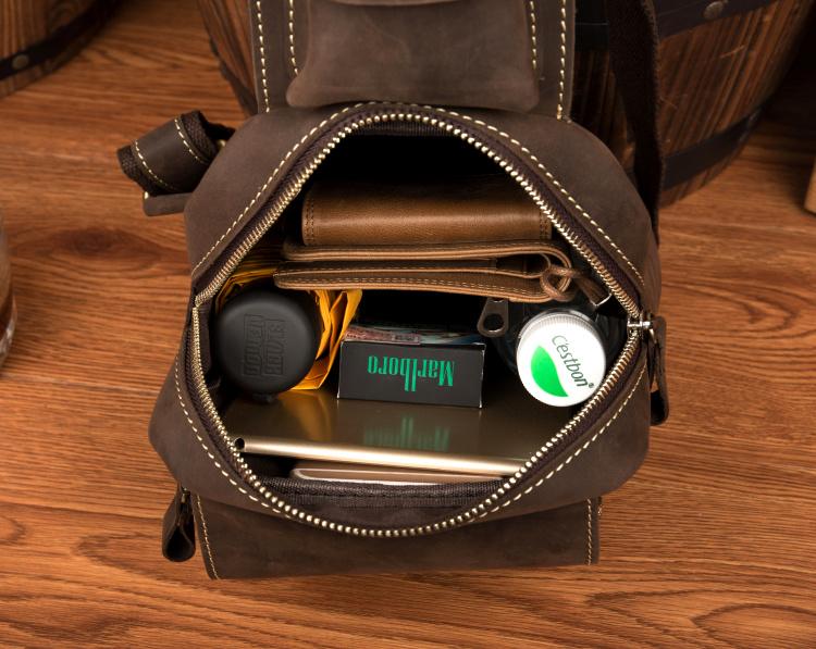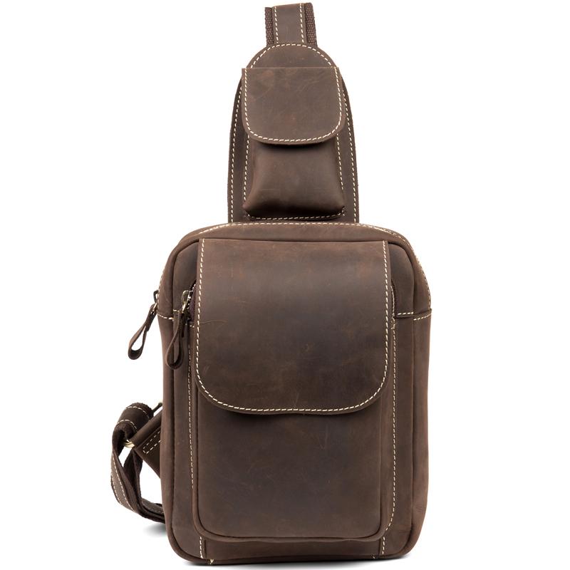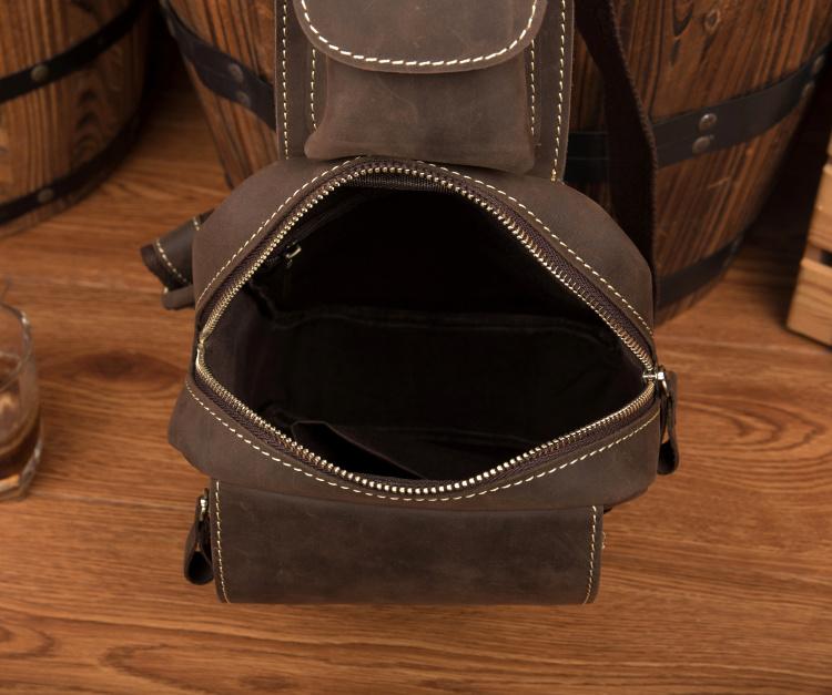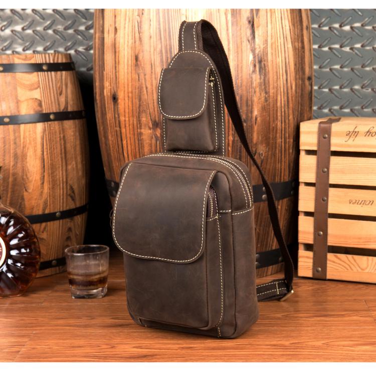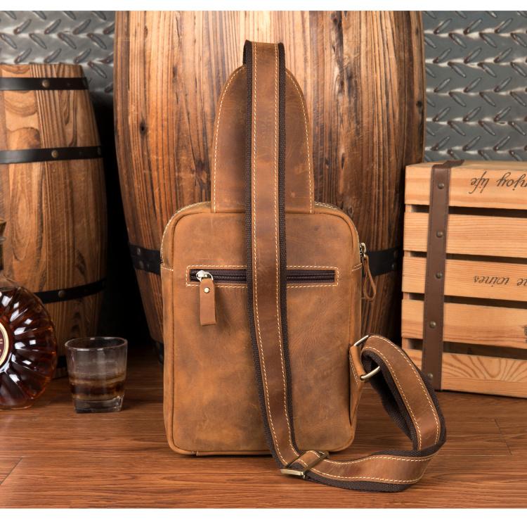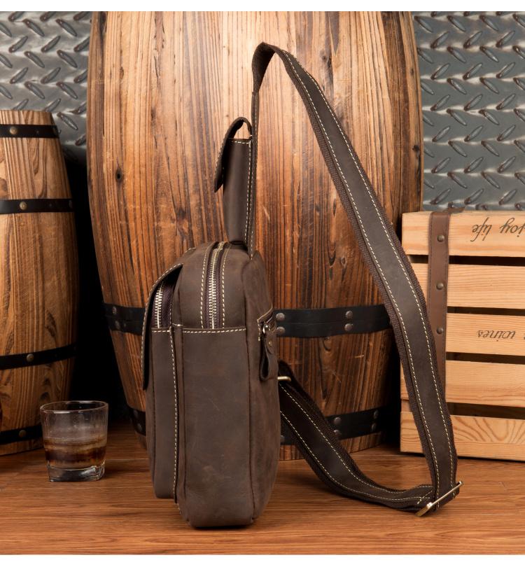 Design: Dark Brown Leather Mens Cool 8 inches Sling Bag Light Brown Crossbody Bag Chest Bag for men
