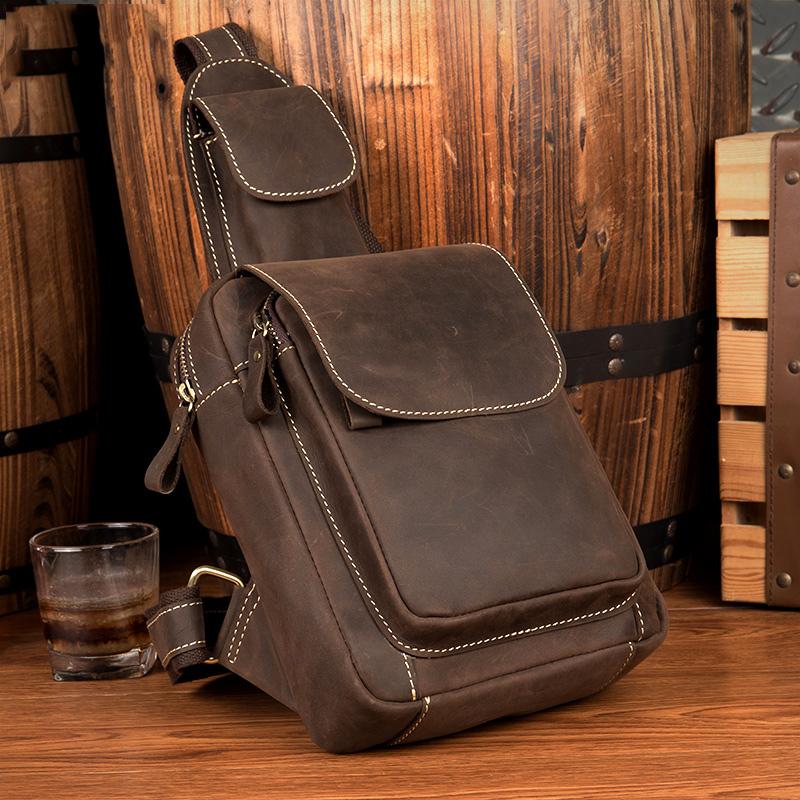 Style: Dark Brown Leather Mens Cool 8 inches Sling Bag Light Brown Crossbody Bag Chest Bag for men